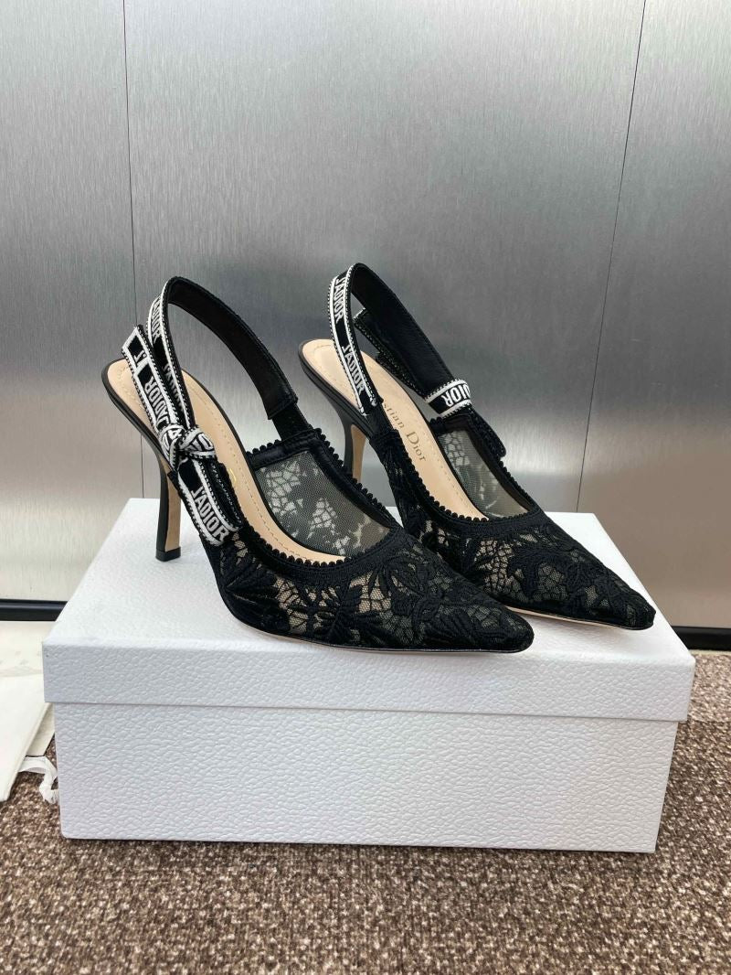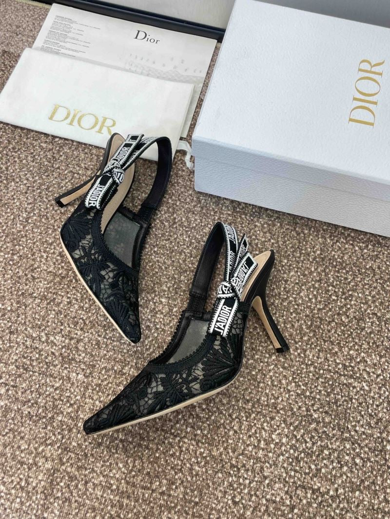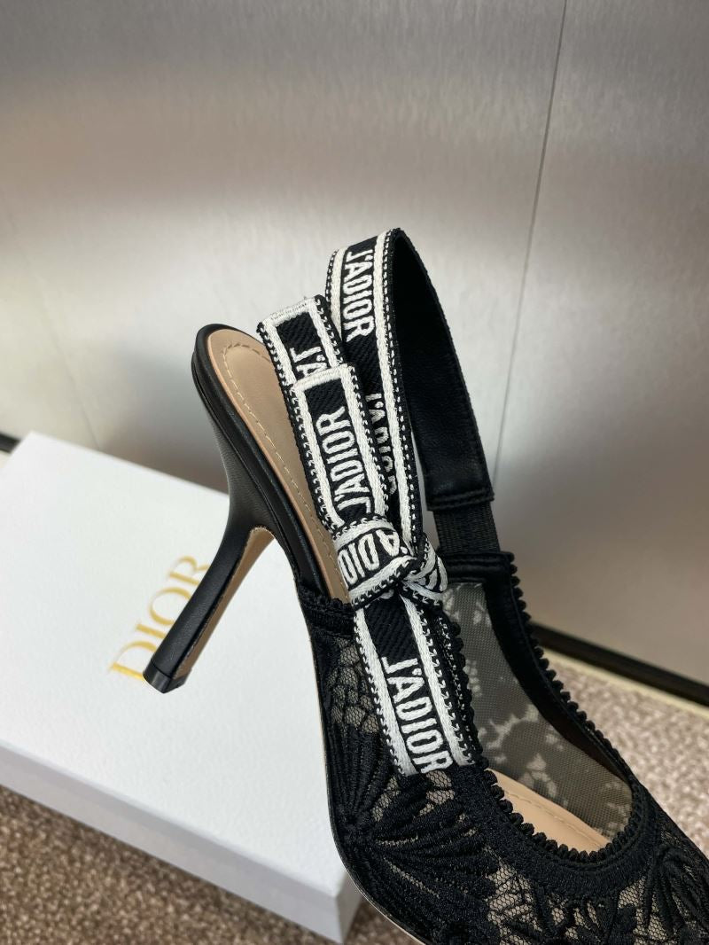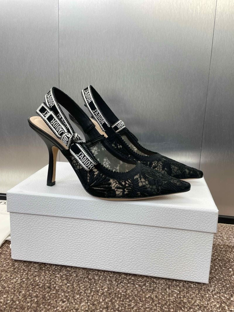 Step into elegance with these striking Dior-inspired black slingback heels. Designed with intricate floral lace embroidery, a sharp pointed toe, and the signature “J’ADIOR” embroidered strap, they exude Parisian sophistication. The stiletto heel adds height and poise — perfect for nights out, weddings, or any glam occasion.
