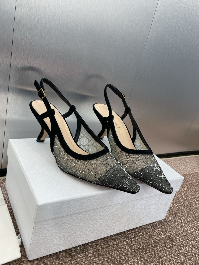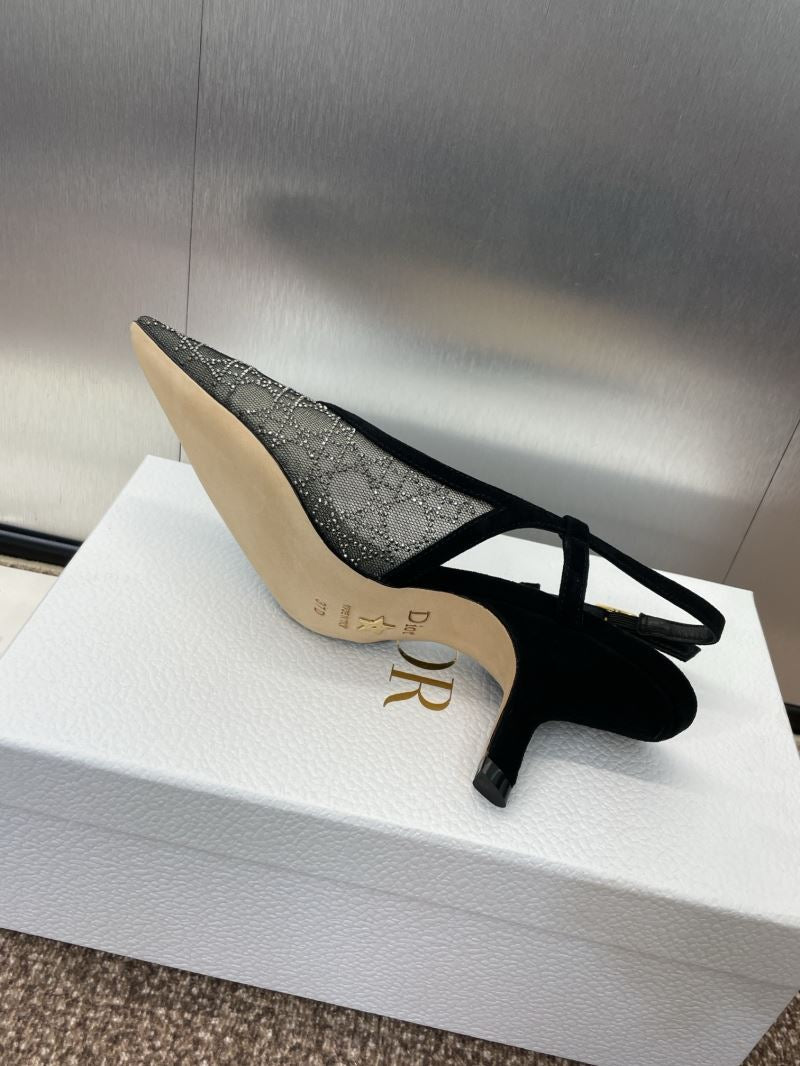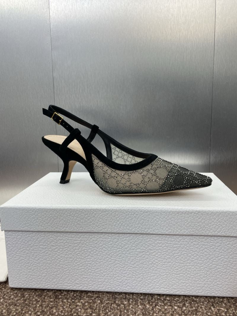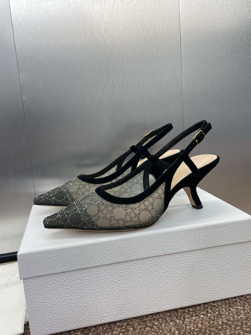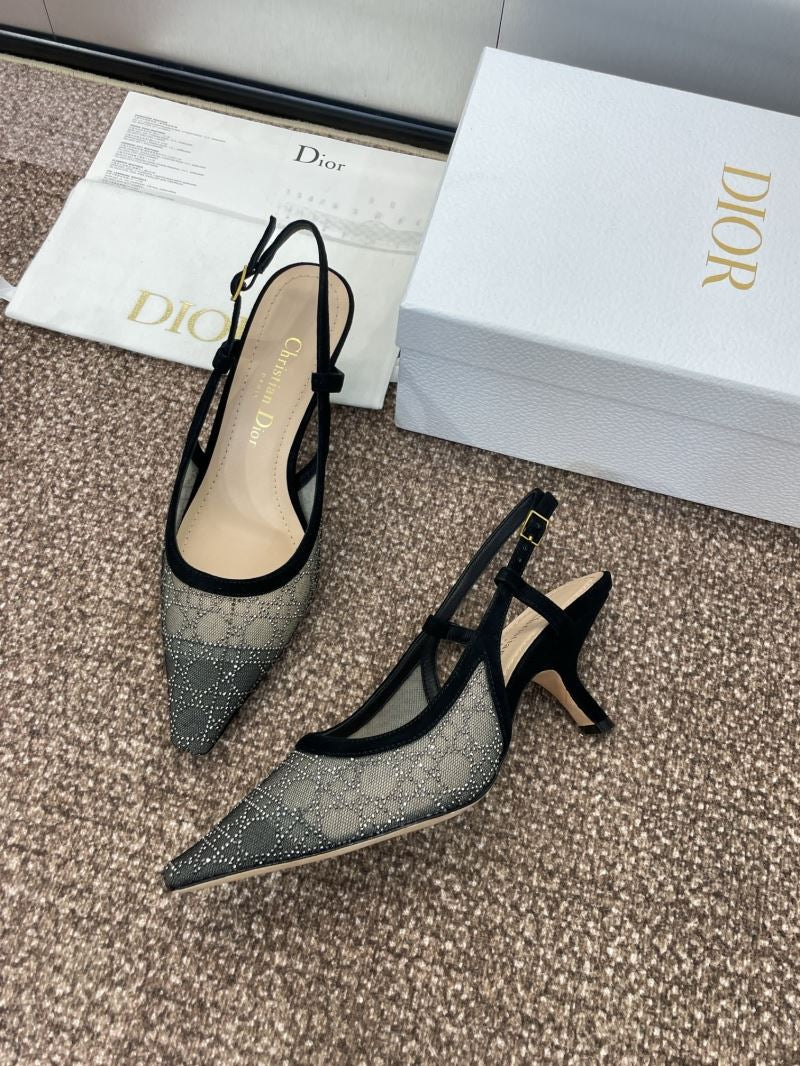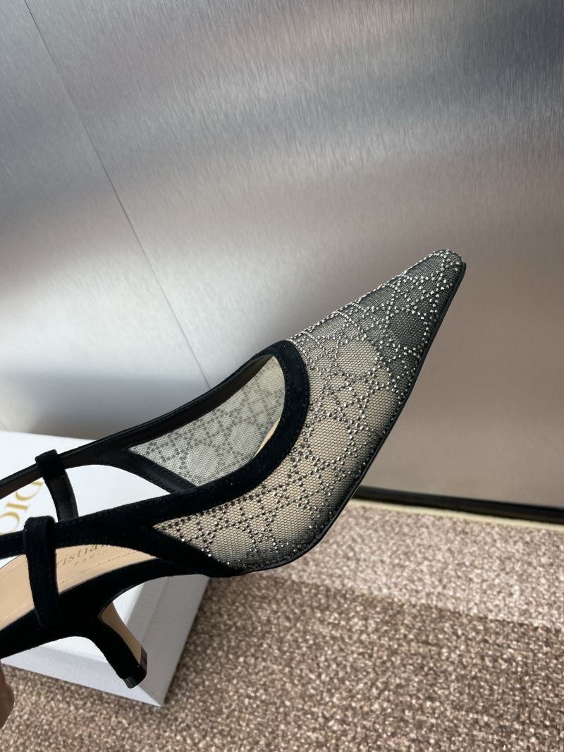 Bold and beautiful, these Dior-inspired slingback heels in black feature a sheer monogram mesh, pointed toe, and delicate ankle strap with gold buckle. Designed with a 2.5-inch kitten heel, they strike the perfect balance between statement style and all-day comfort.