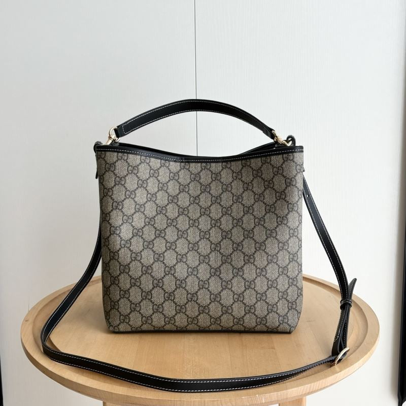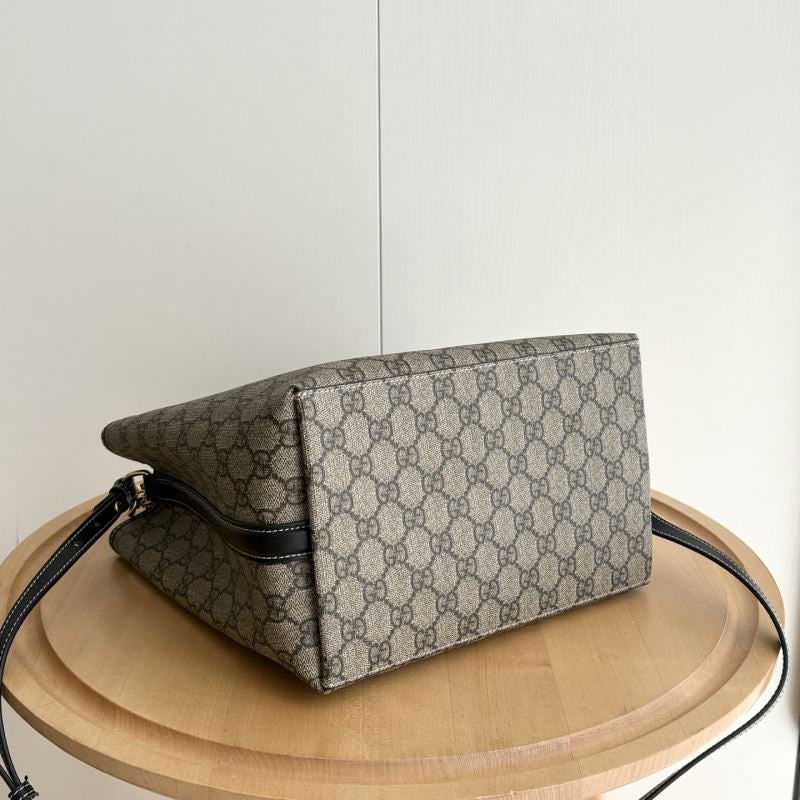 The new GG Emblem collection reinterprets the House’s history of elegance and craftsmanship. This bucket bag highlights a functional design with two main compartments in Web cotton lining and a zip pocket in the middle.