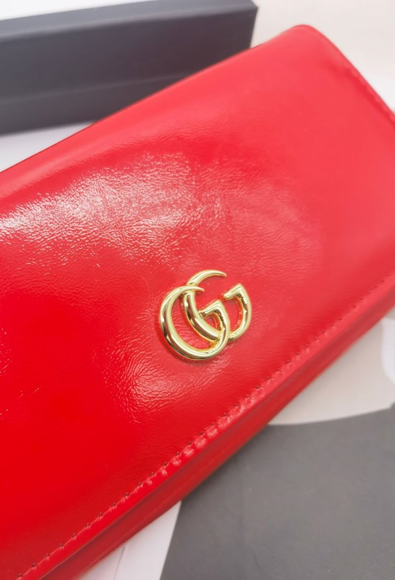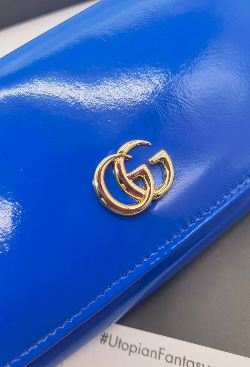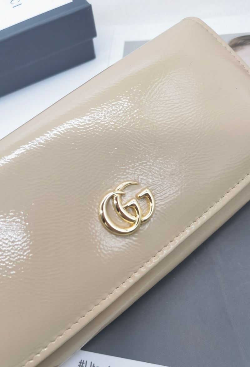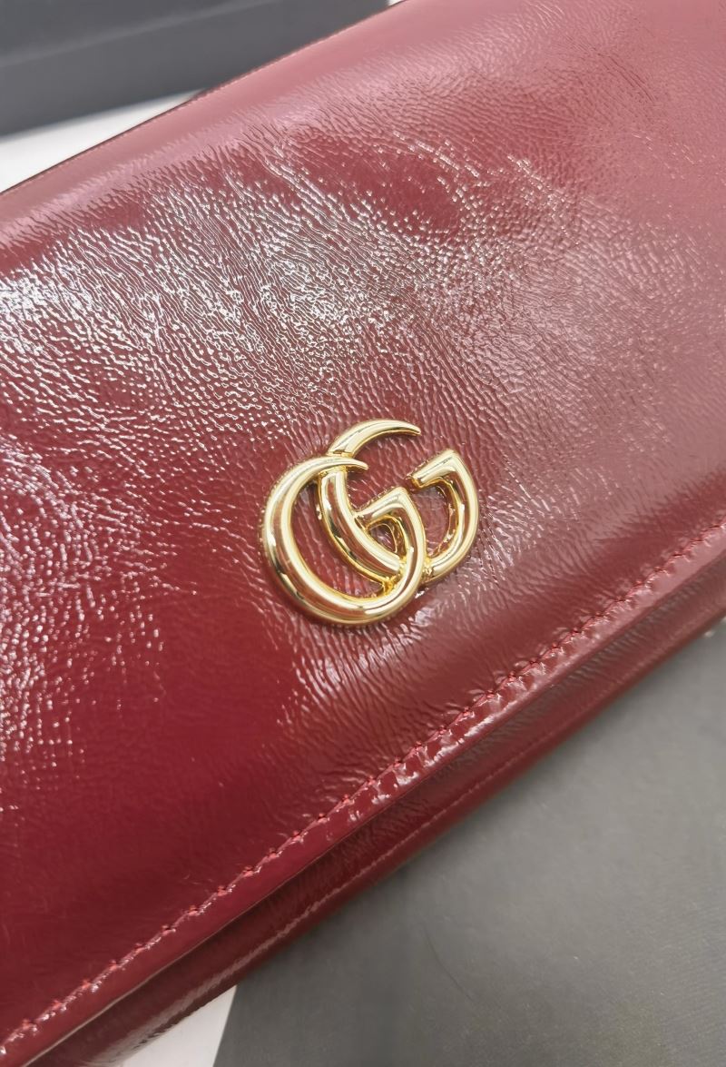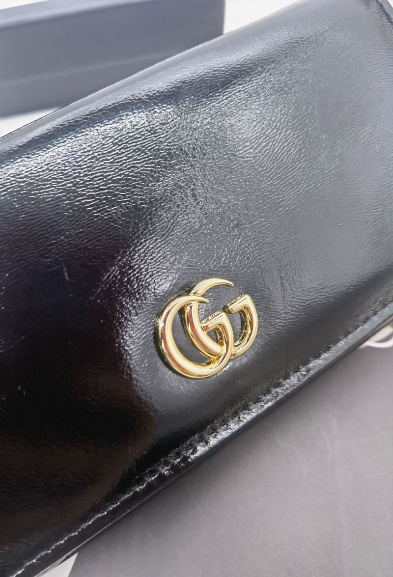 • Features a sleek, high-shine patent finish with the classic GG logo in gold