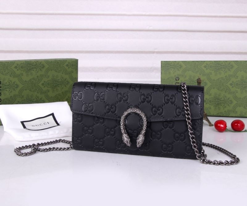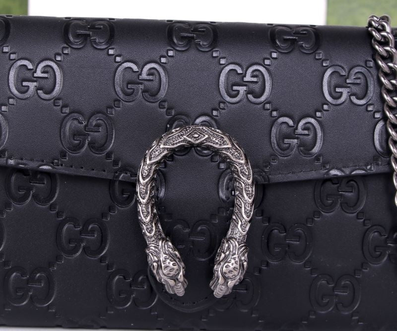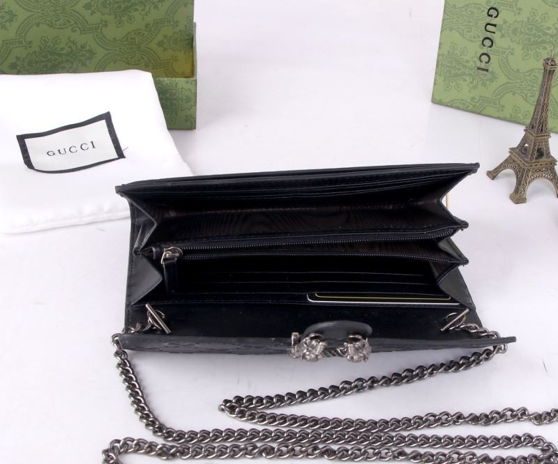 Elevate your style with this sleek black embossed GG Dionysus wallet featuring a bold tiger-head clasp and elegant gunmetal chain strap. Compact yet spacious with multiple card slots and a secure zip compartment.