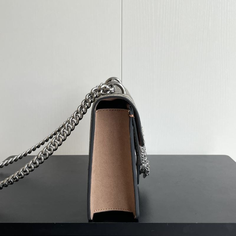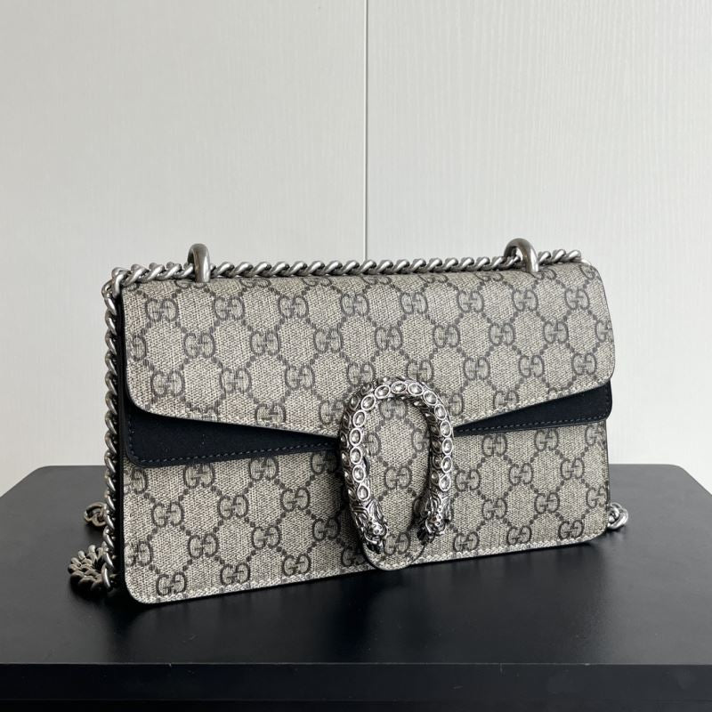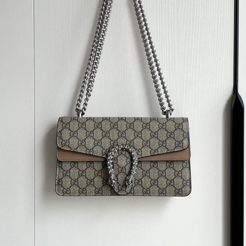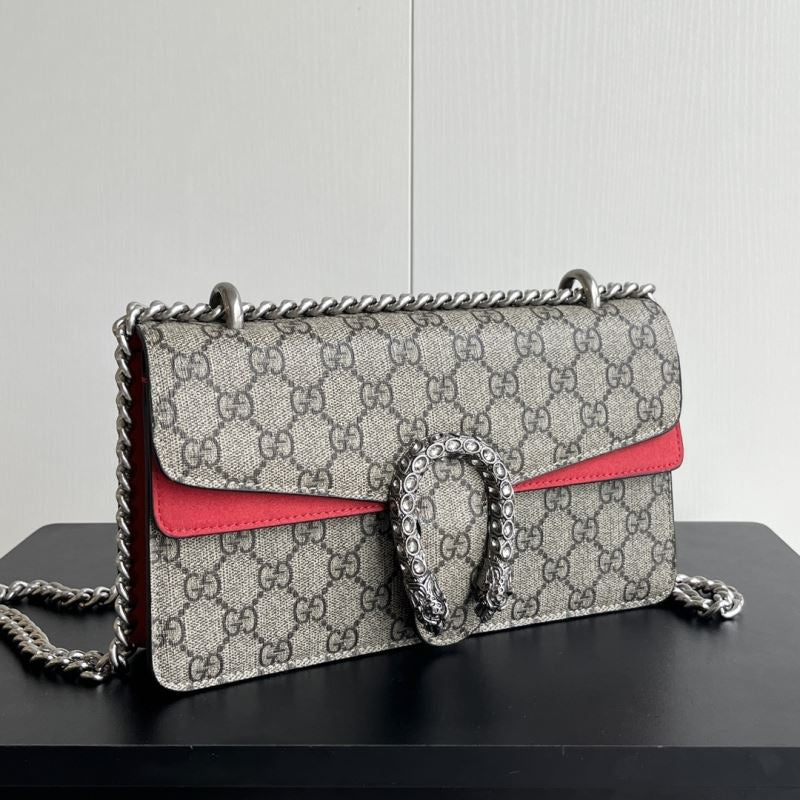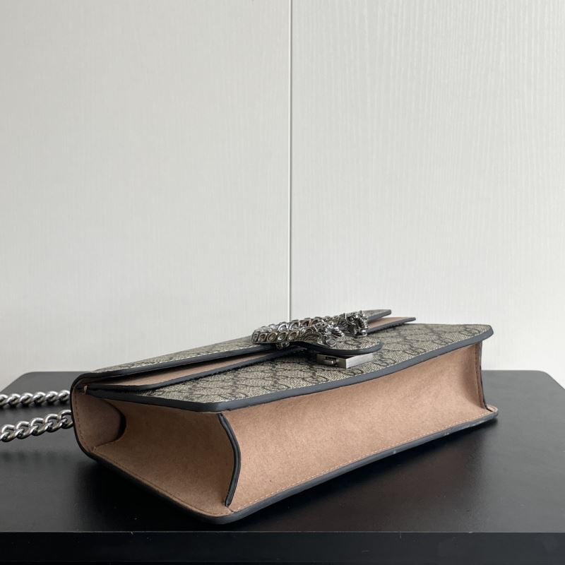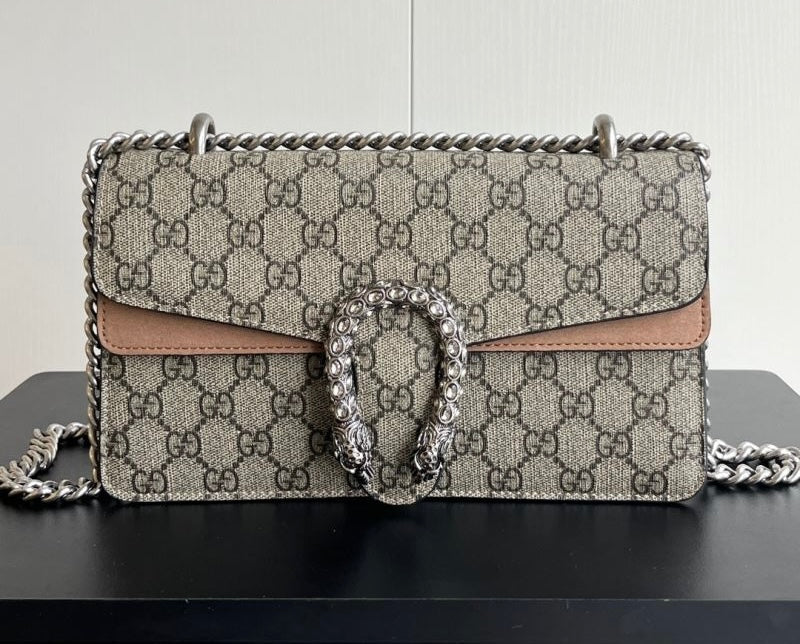 A striking replica of the iconic Gucci Dionysus shoulder bag, this piece features the classic GG Supreme canvas paired with your choice of bold black, soft brown, or vibrant red suede trim. The standout detail is the signature textured tiger head spur closure, adding a touch of fierce elegance. The silver-toned chain strap allows for shoulder or crossbody wear. Interior compartments provide ample space for your daily essentials.