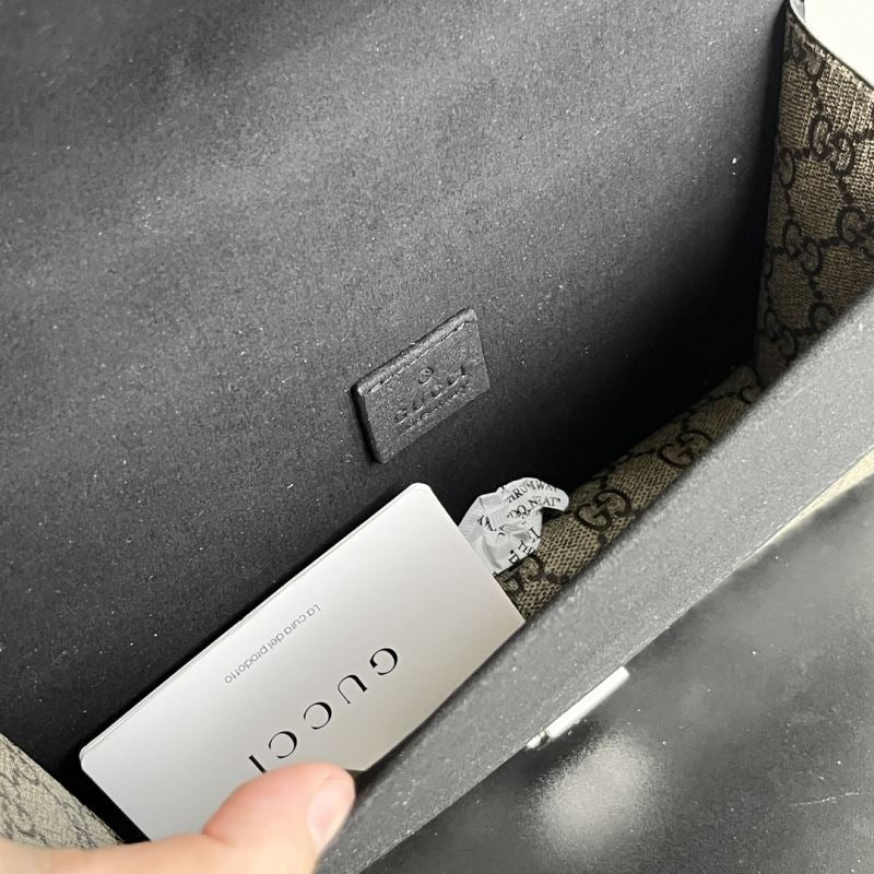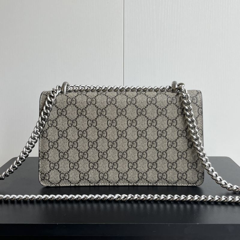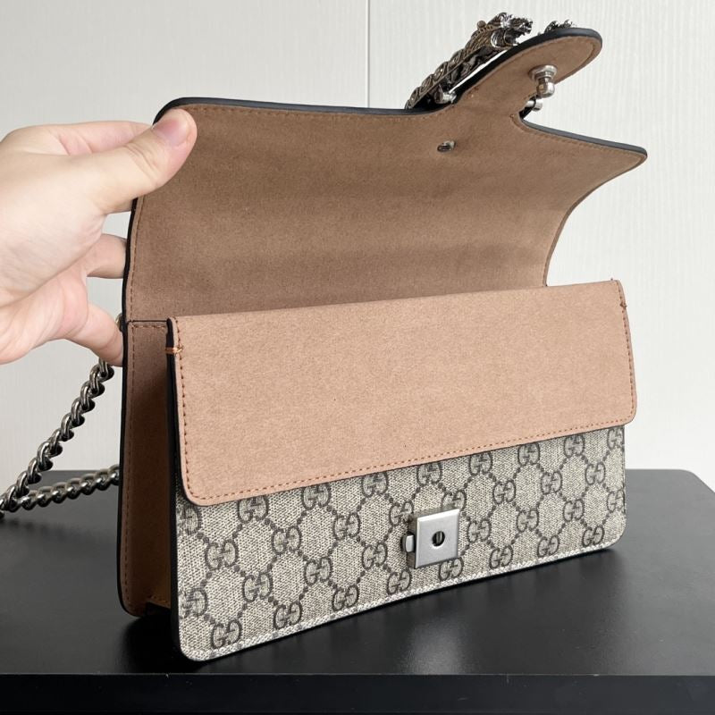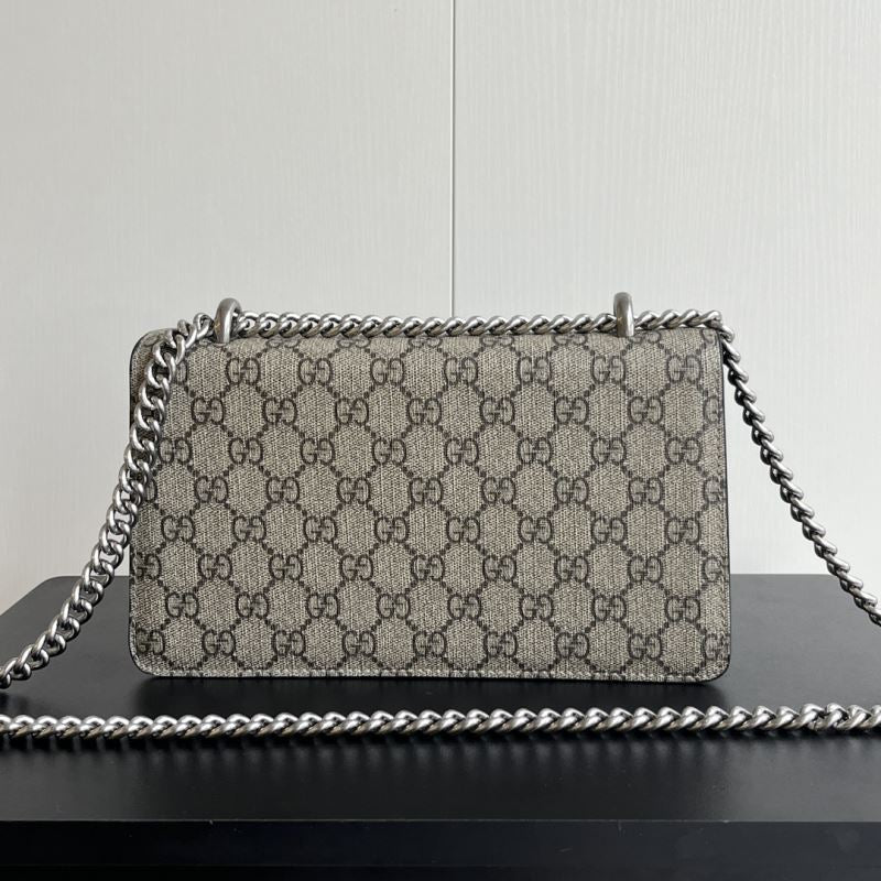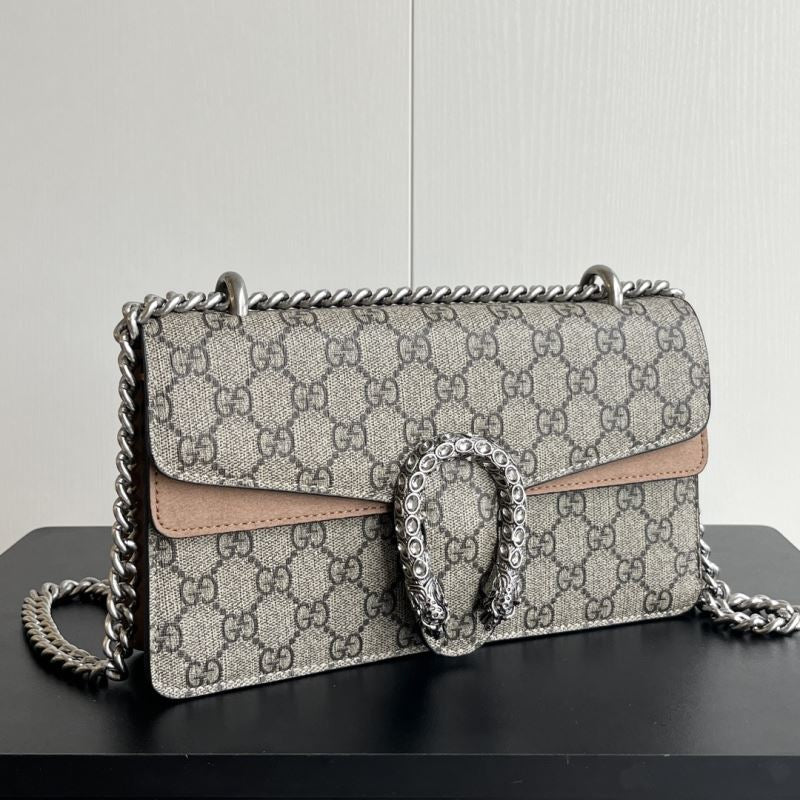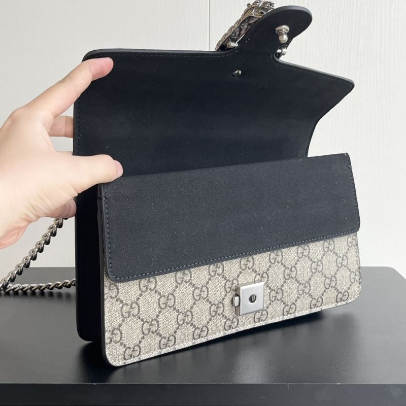 A striking replica of the iconic Gucci Dionysus shoulder bag, this piece features the classic GG Supreme canvas paired with your choice of bold black, soft brown, or vibrant red suede trim. The standout detail is the signature textured tiger head spur closure, adding a touch of fierce elegance. The silver-toned chain strap allows for shoulder or crossbody wear. Interior compartments provide ample space for your daily essentials.