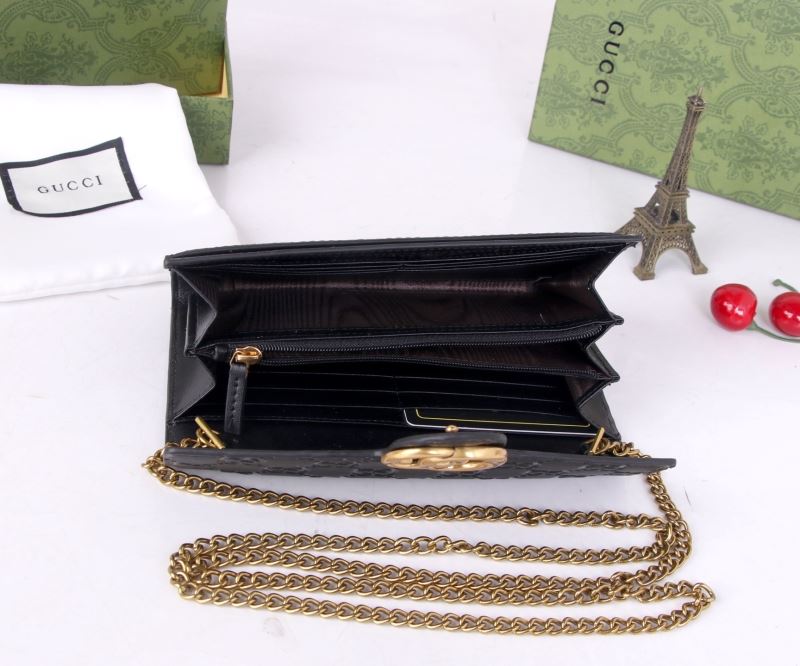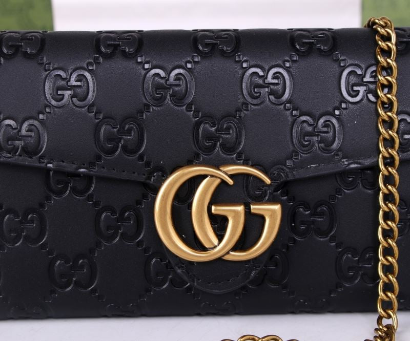 Crafted from sleek black leather with embossed GG logos throughout, this crossbody wallet features a bold gold GG logo clasp and matching gold chain strap for a statement finish. Interior includes multiple card slots, zip compartment, and spacious dividers for easy organization.