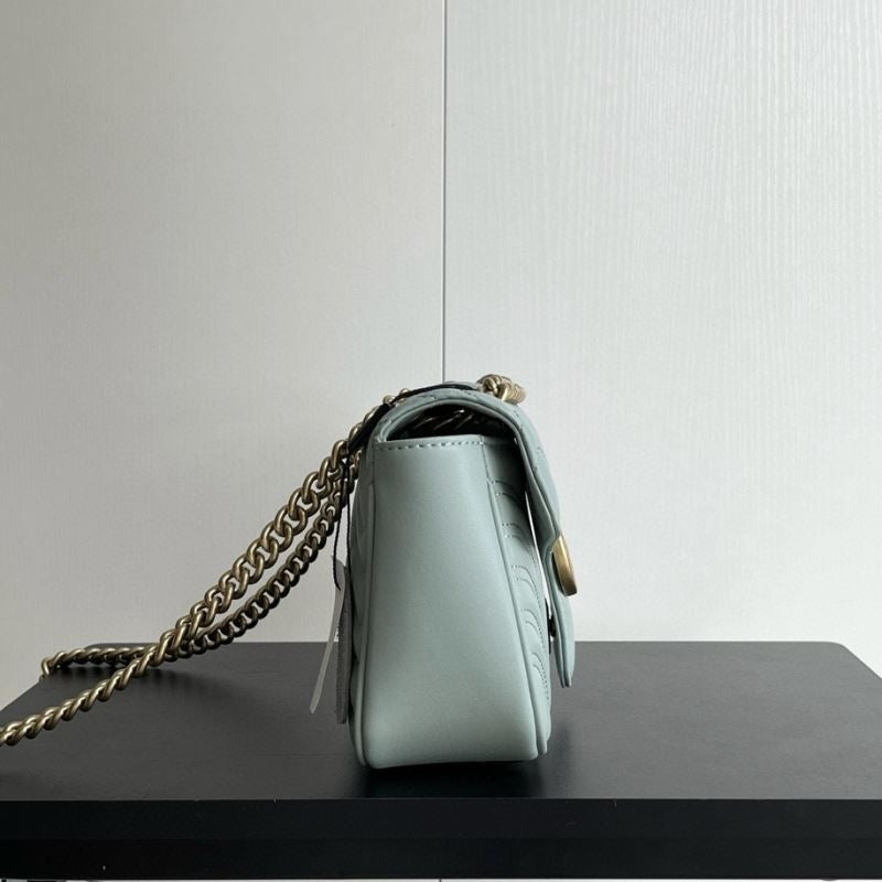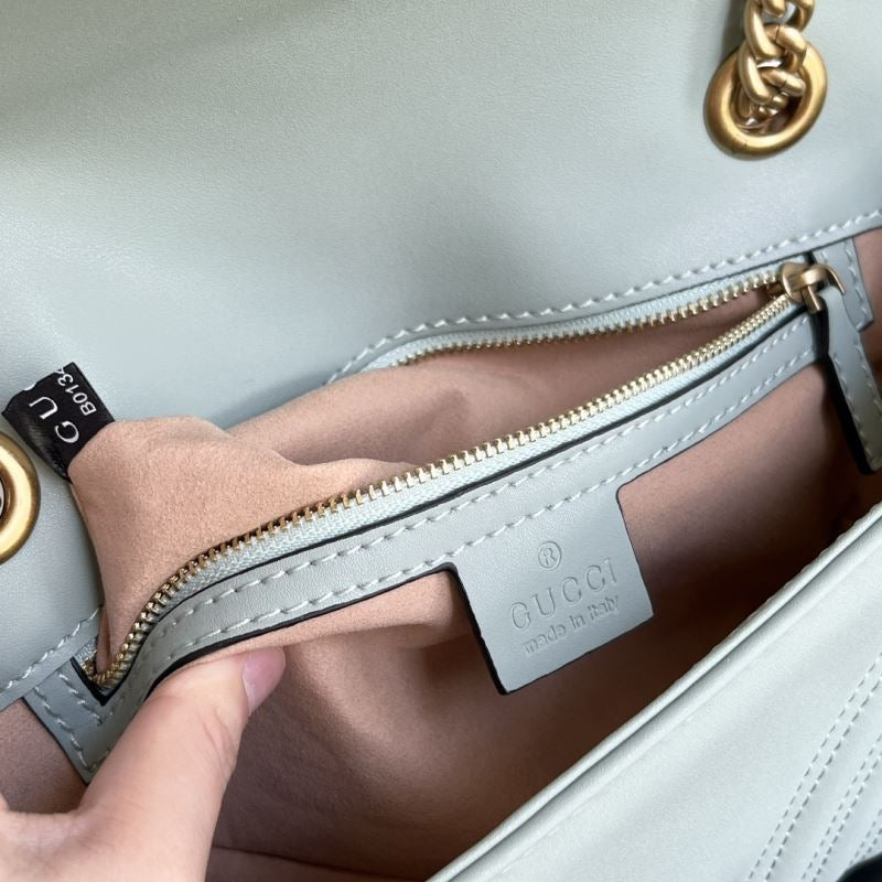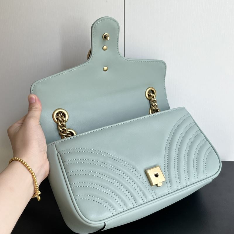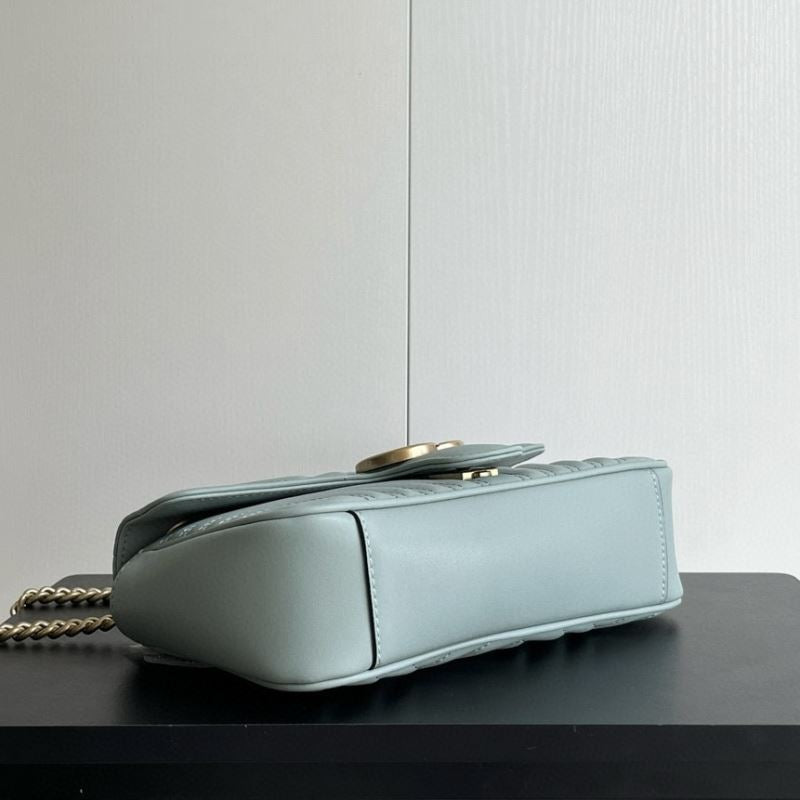 • Crafted from luxurious quilted leather in a soft pastel mint shade, complemented by the signature antique gold GG logo.