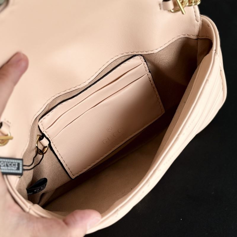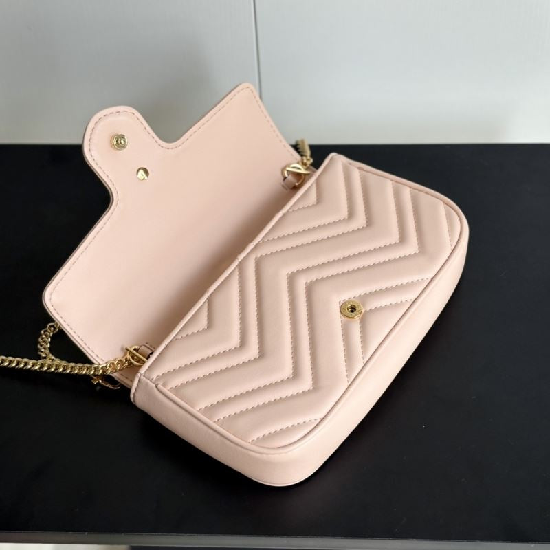 This GG Marmont small bag is crafted from a light pink chevron leather. The signature Double G hardware defines the accessory, while a detachable leather card case completes the style.
