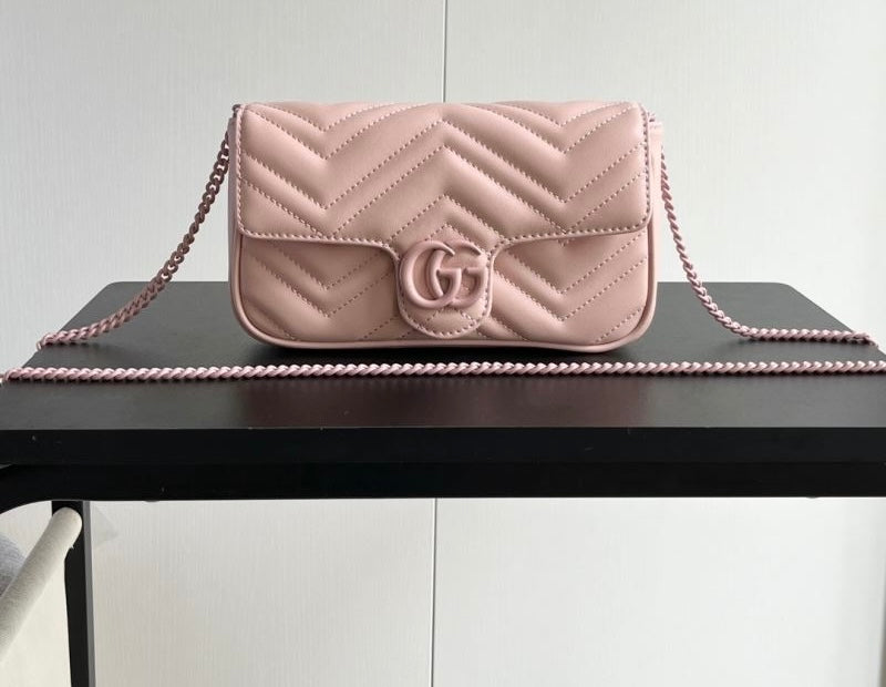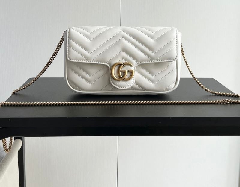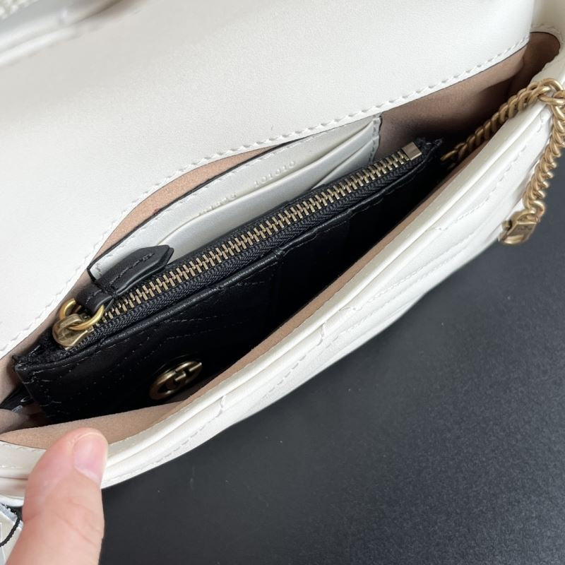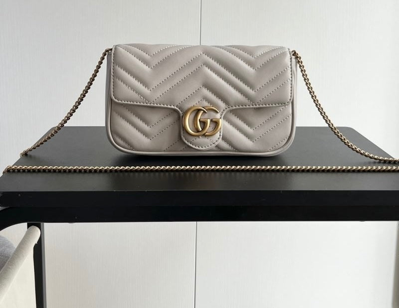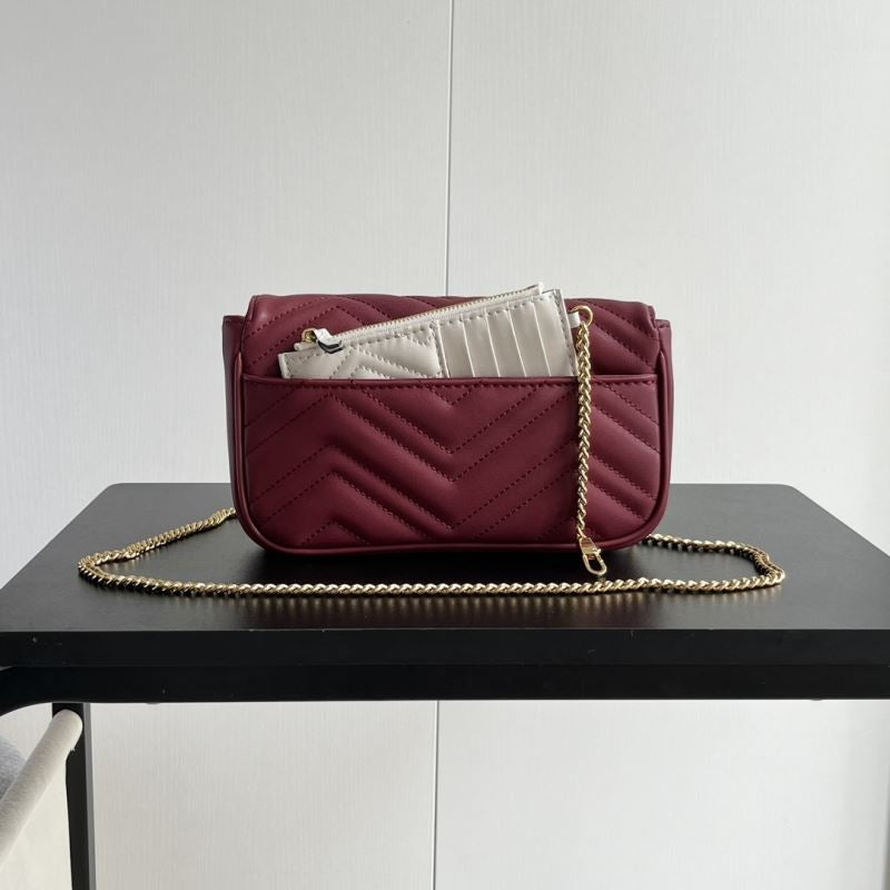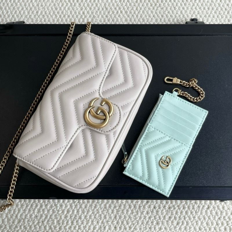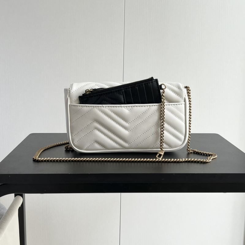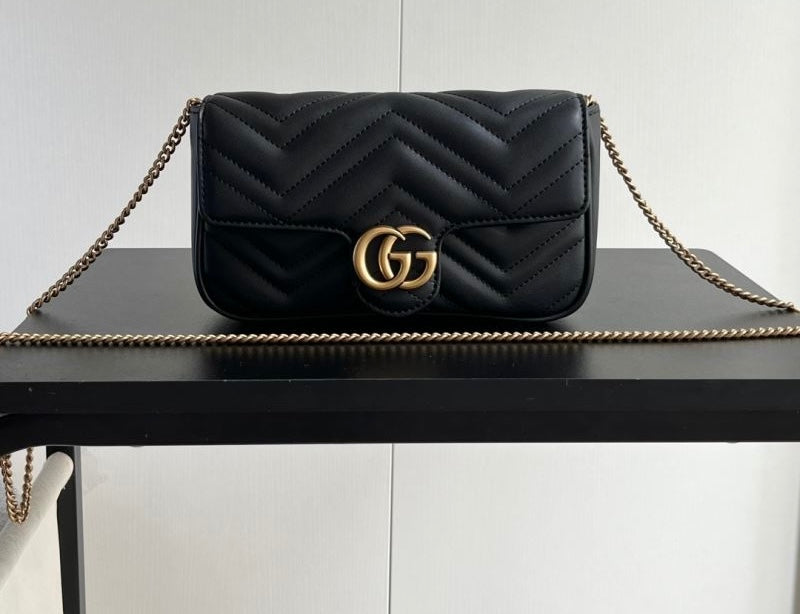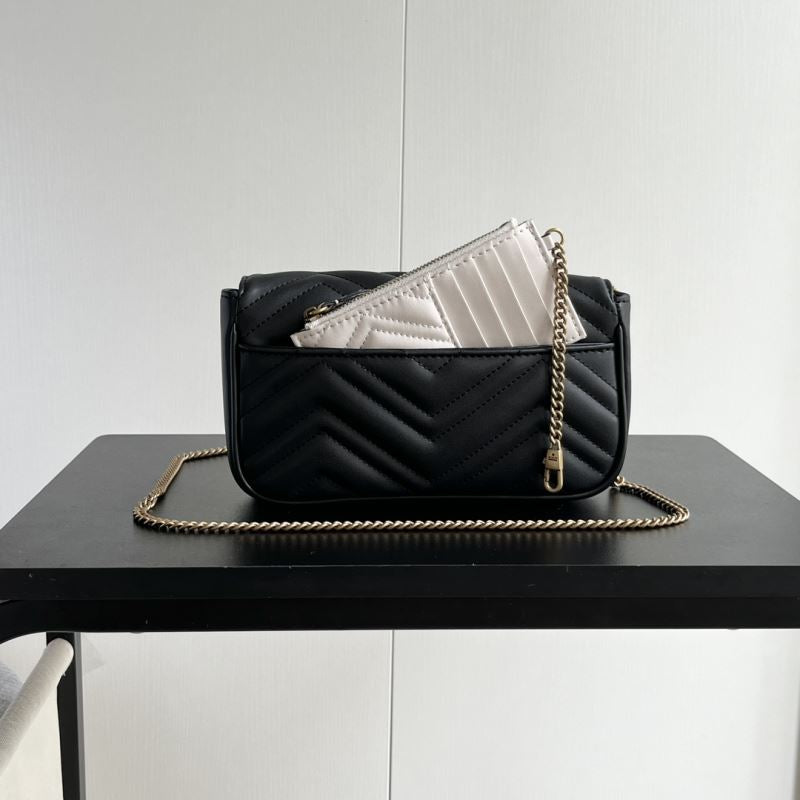 The Double G hardware brings the past into the House's present with the notion that a cherished wardrobe is enriched by items that can be worn season after season. This bag with a chain strap is crafted from the signature matelassé chevron leather in black, while the inside features a contrasting white leather card case that can be detached.