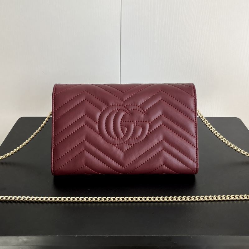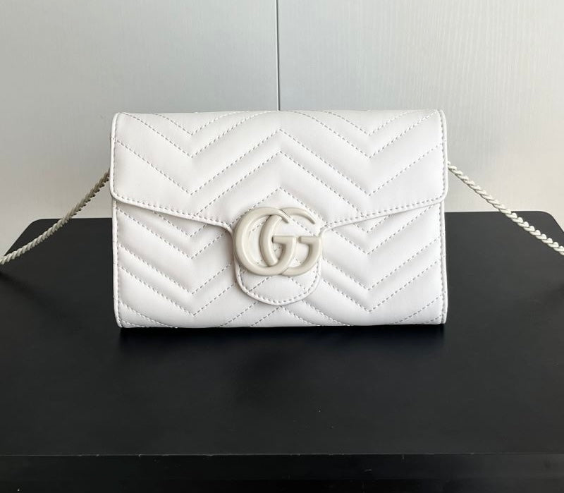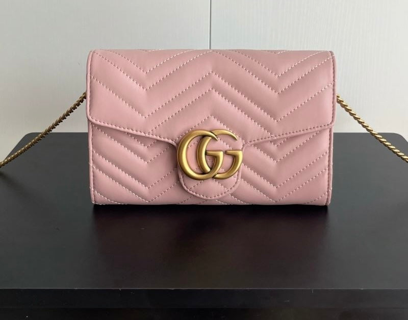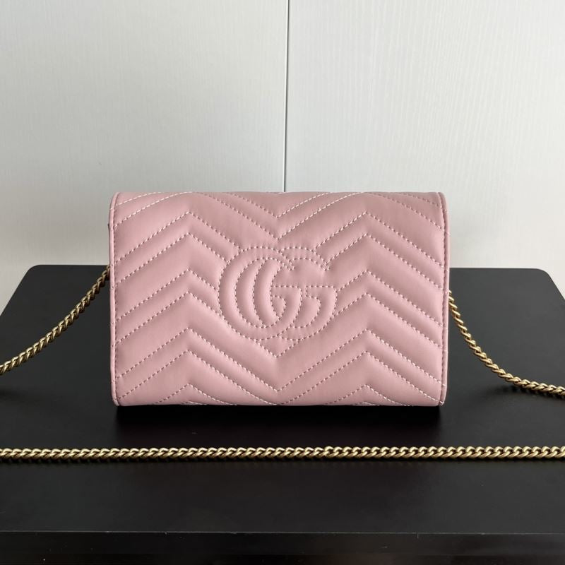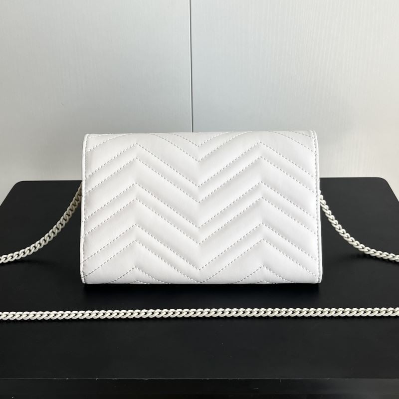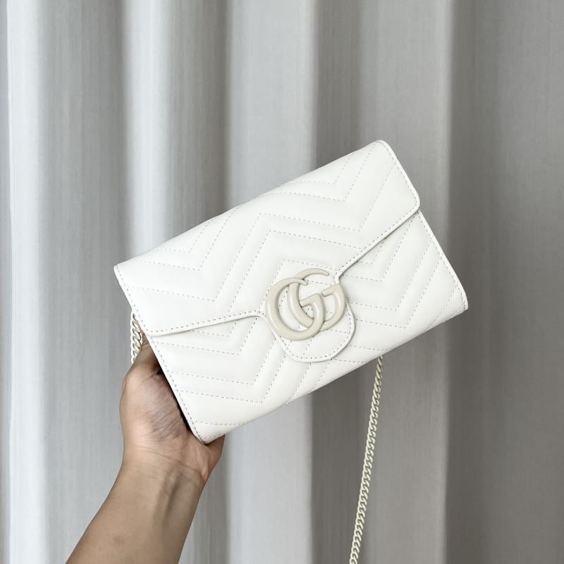 A tonal Double G hardware brings the past into the House's present, with the notion that a cherished wardrobe is enriched by items that can be worn season after season. This wallet on chain is crafted from the signature light grey matelassé chevron leather, while the inside features multiple card slots.
