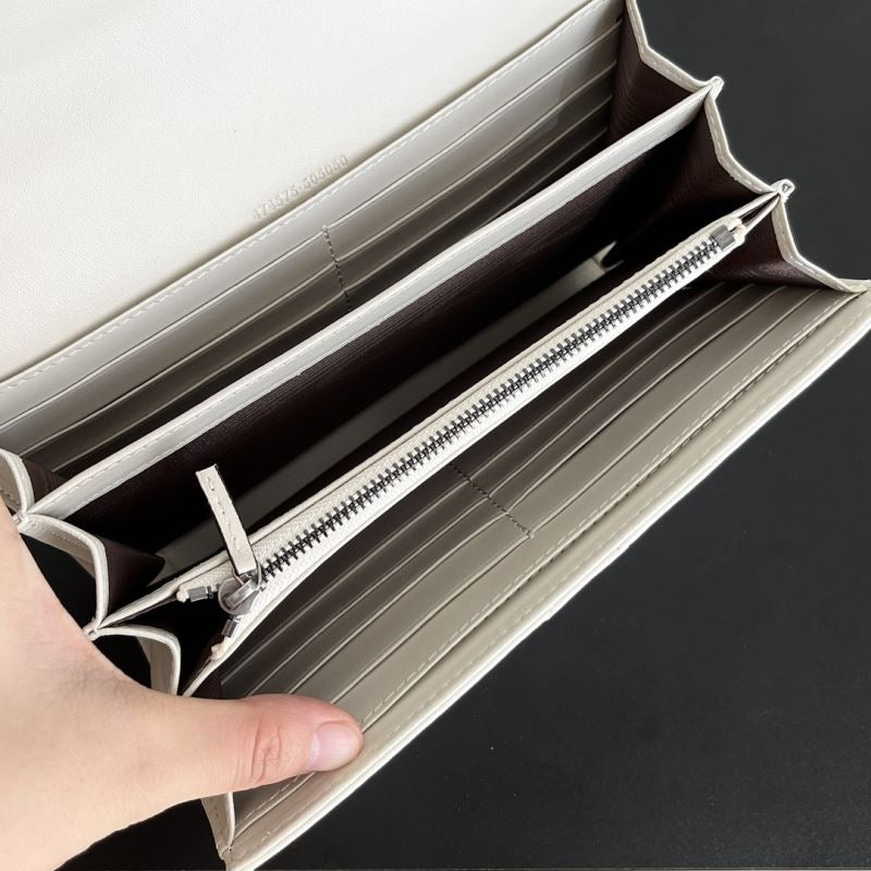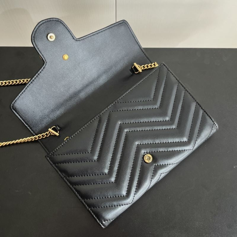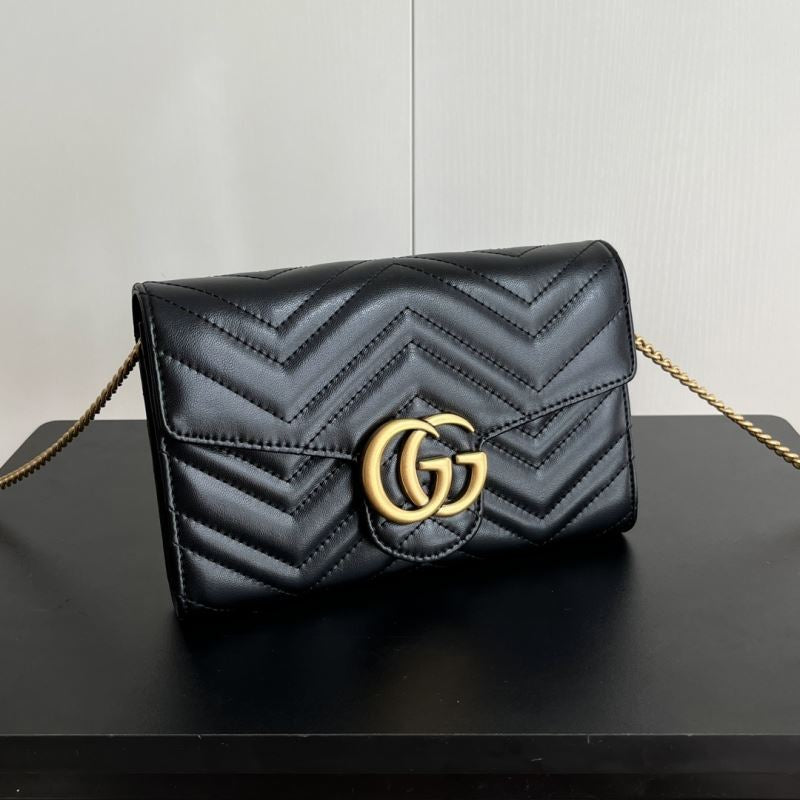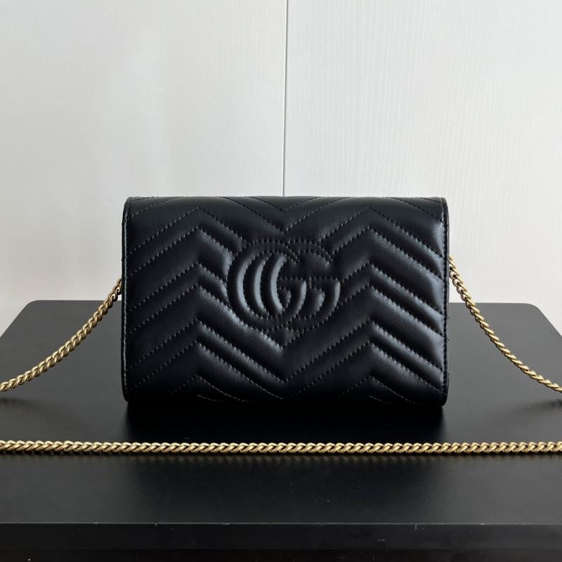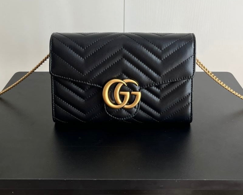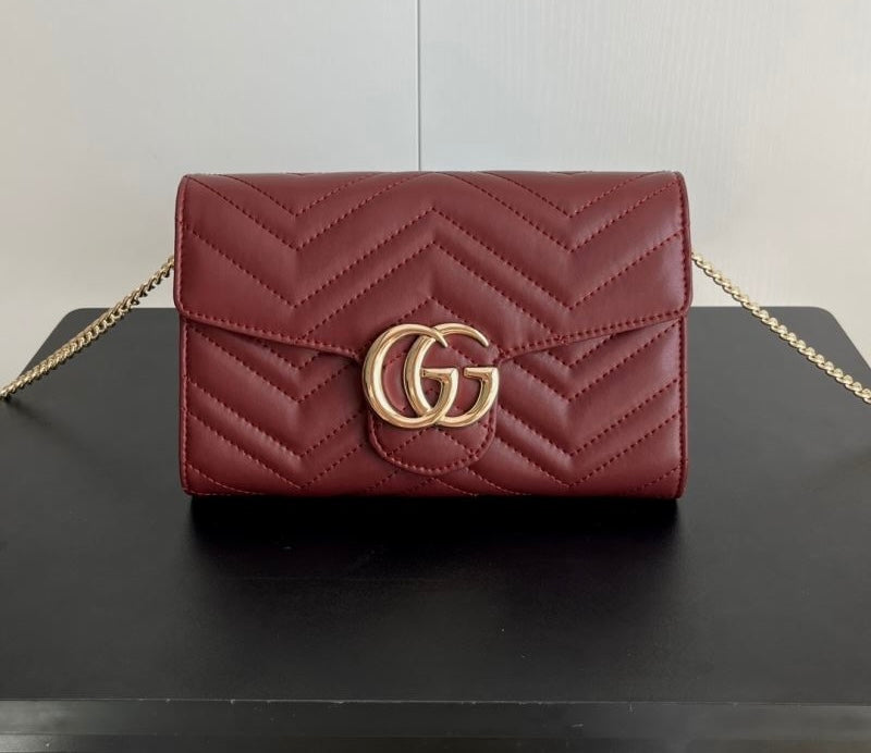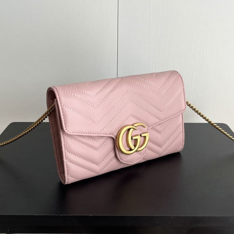 A tonal Double G hardware brings the past into the House's present, with the notion that a cherished wardrobe is enriched by items that can be worn season after season. This wallet on chain is crafted from the signature light grey matelassé chevron leather, while the inside features multiple card slots.