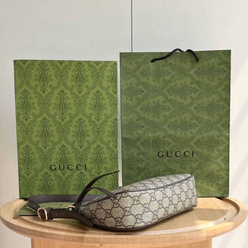 • Designed in GG Supreme beige canvas with smooth black leather trim and gold-tone GG hardware on the front.