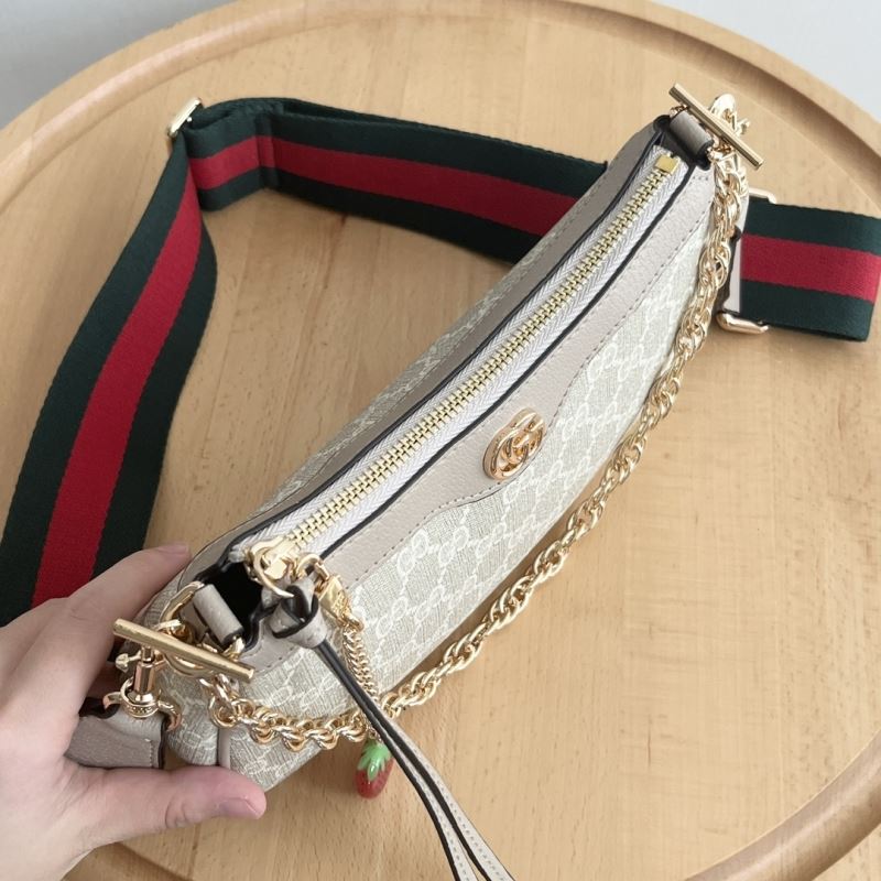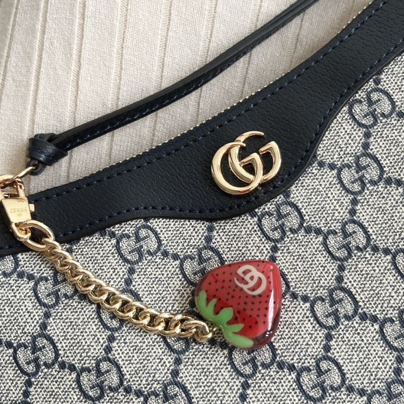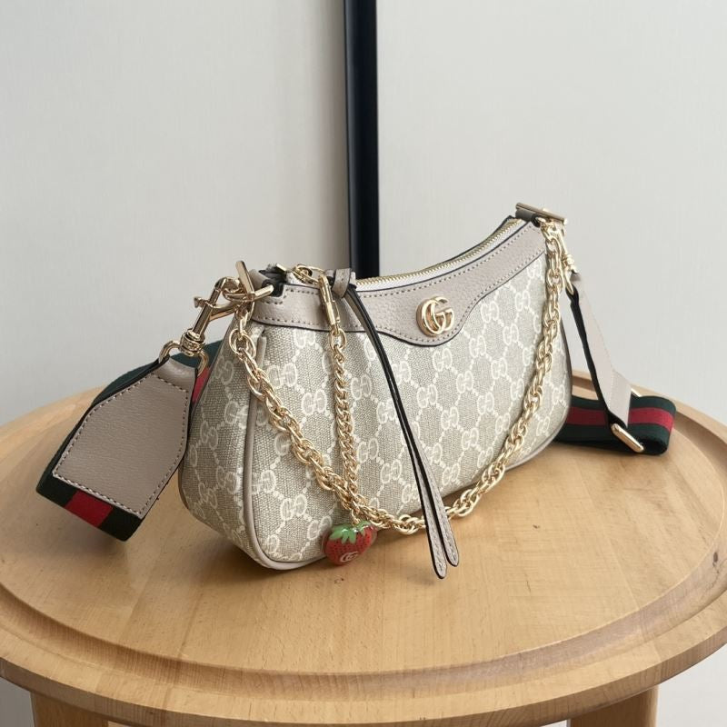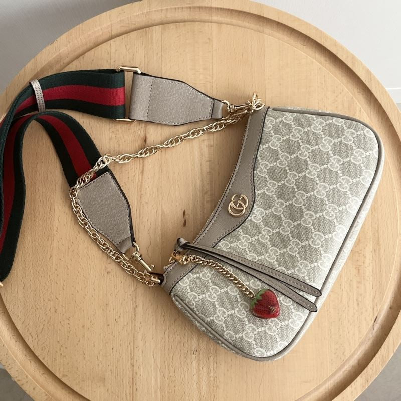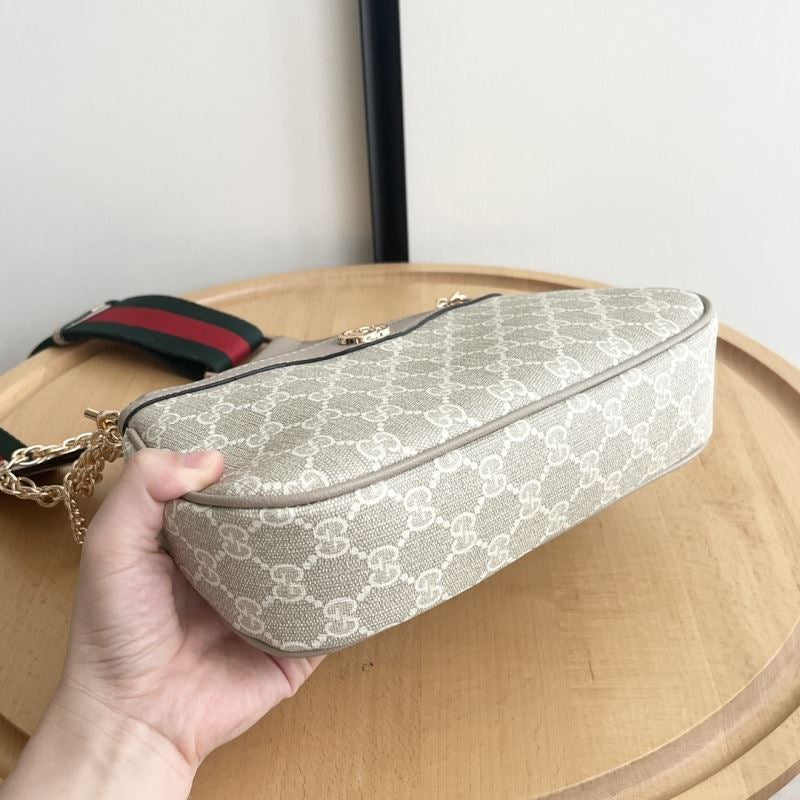 • Includes zip closure, detachable chunky gold chain, and signature red-green web strap for crossbody or shoulder wear.