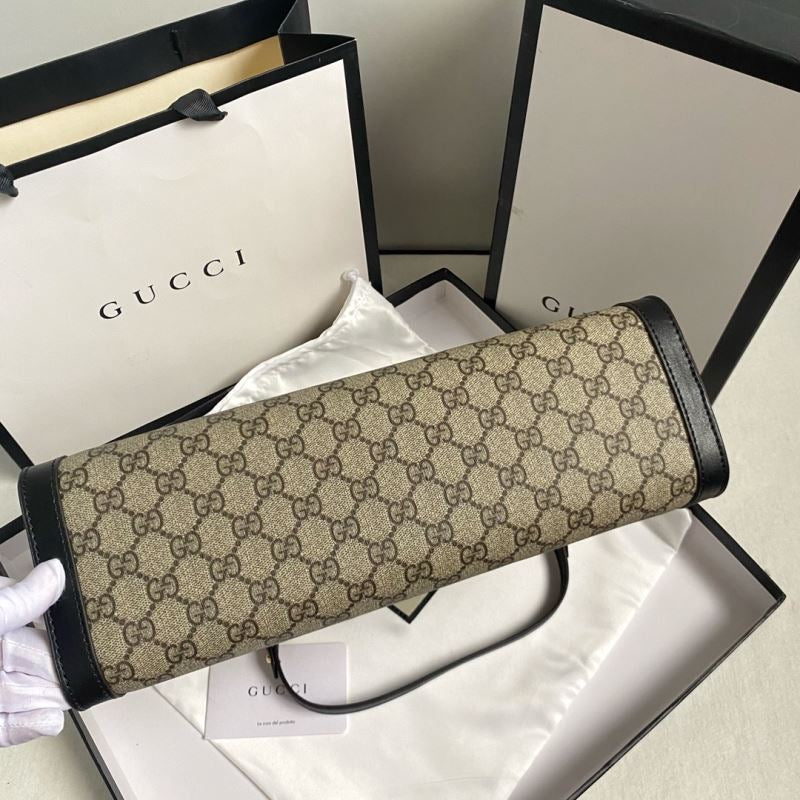 A shoulder bag with a strap that secures with a key lock closure pulled straight from the archives. The structured shape is crafted from beige and ebony GG Supreme and completed with black leather details. First used in the 1970s, the GG logo was an evolution of the original Gucci rhombi design from the 1930s, and from then it's been an established symbol of the House's heritage.