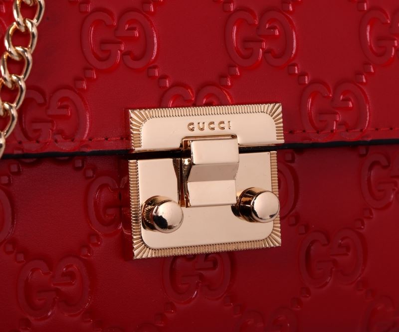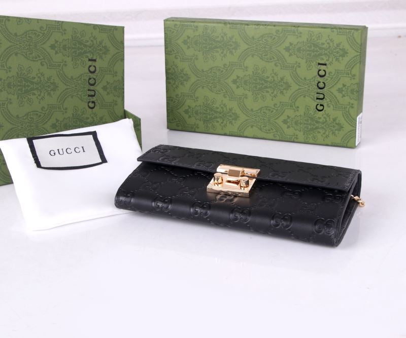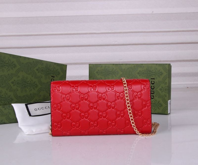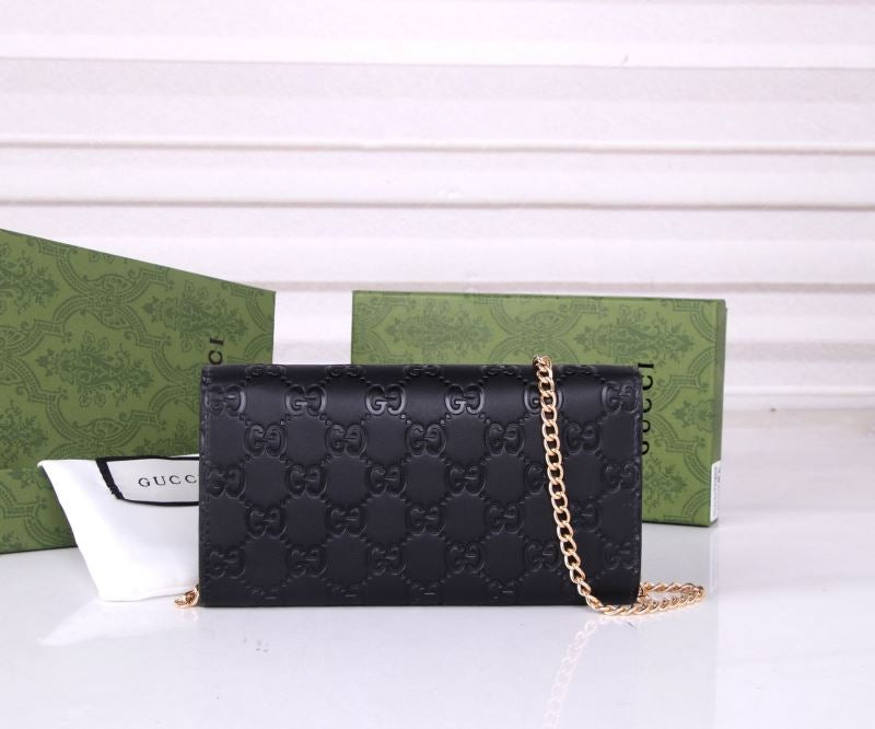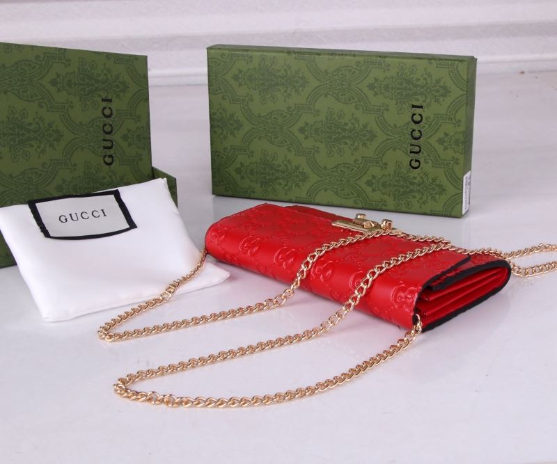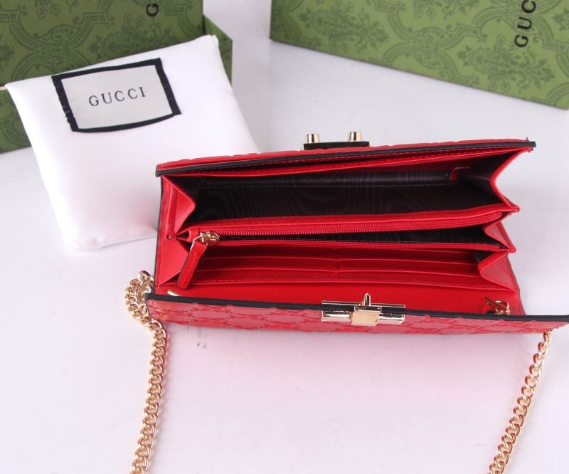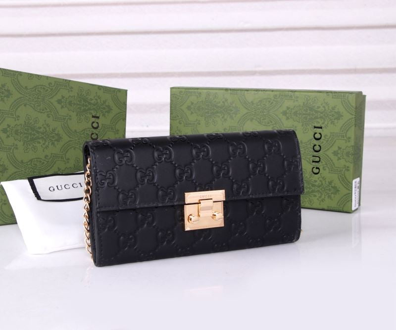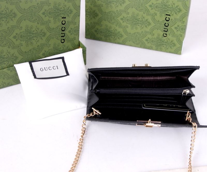This sleek chain wallet features a glossy GG-embossed exterior with Gucci’s iconic padlock clasp in gold-tone hardware. Available in bold red or classic black, each wallet includes a secure push-lock closure, multiple card slots, a zippered coin compartment, and a gold chain strap for shoulder or crossbody wear. A modern and structured silhouette perfect for day or night styling.