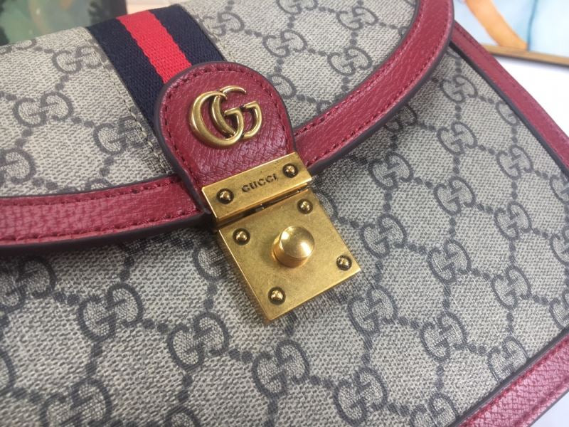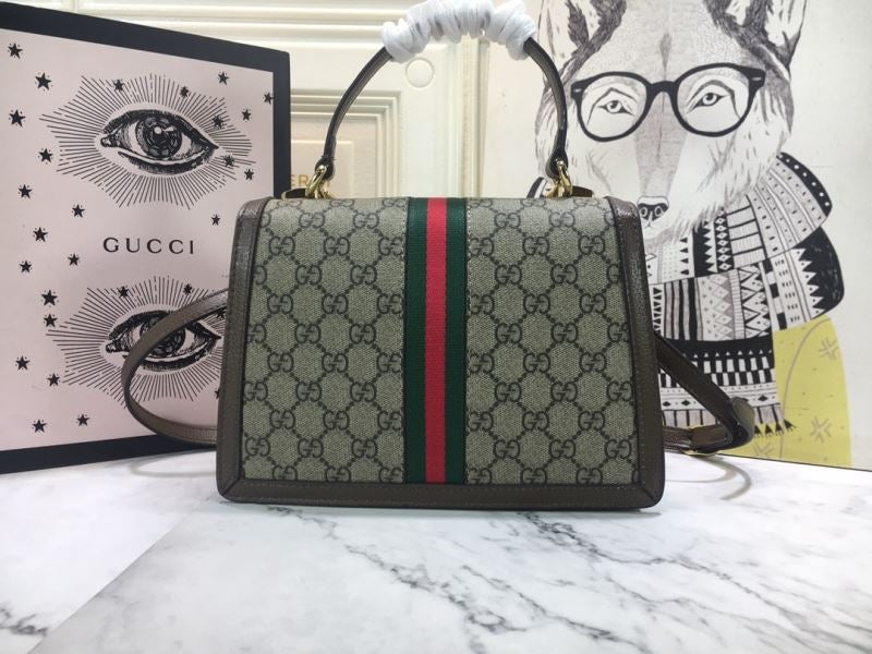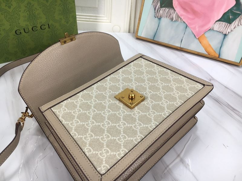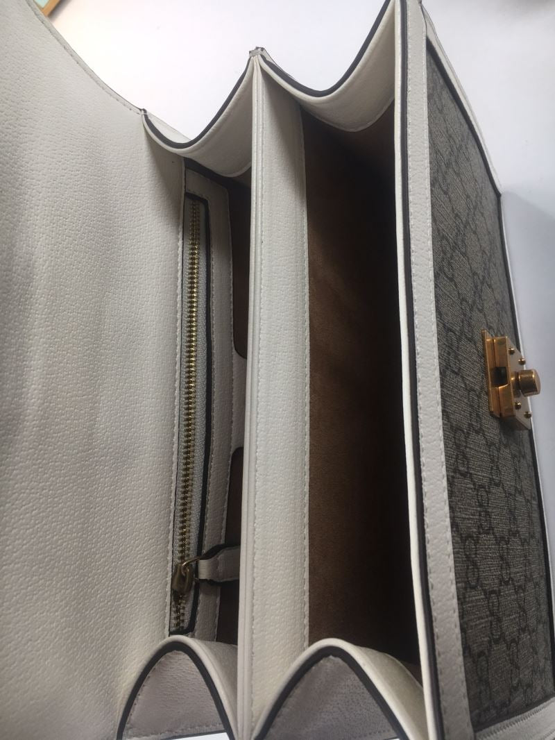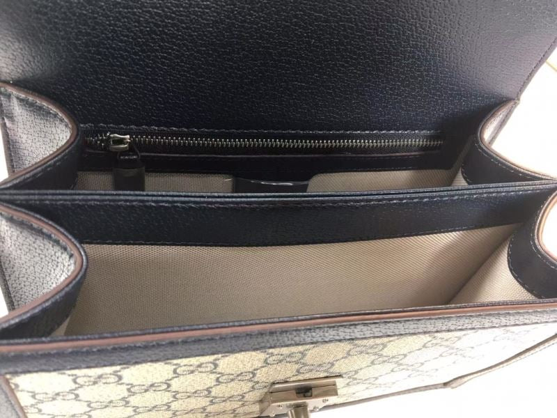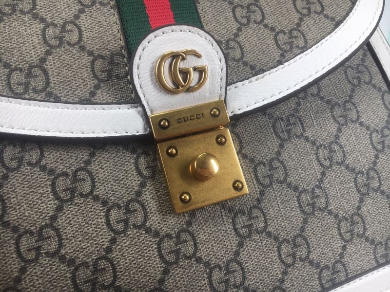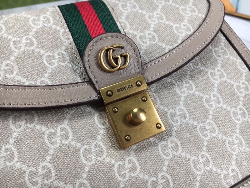 • Designed in GG Supreme beige canvas with taupe leather trim and Gucci’s classic green-red-green web stripe down the center.