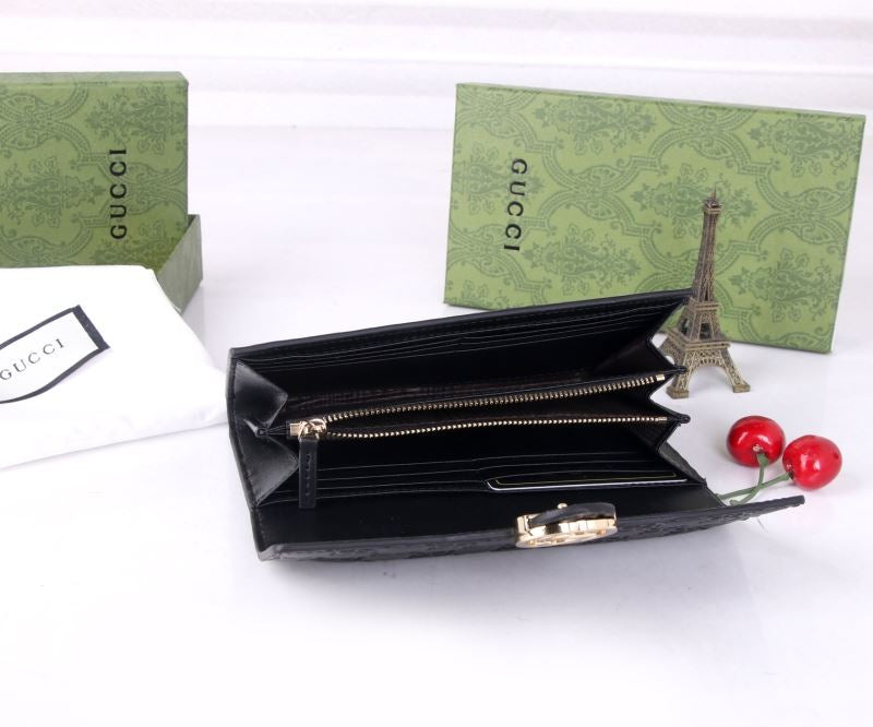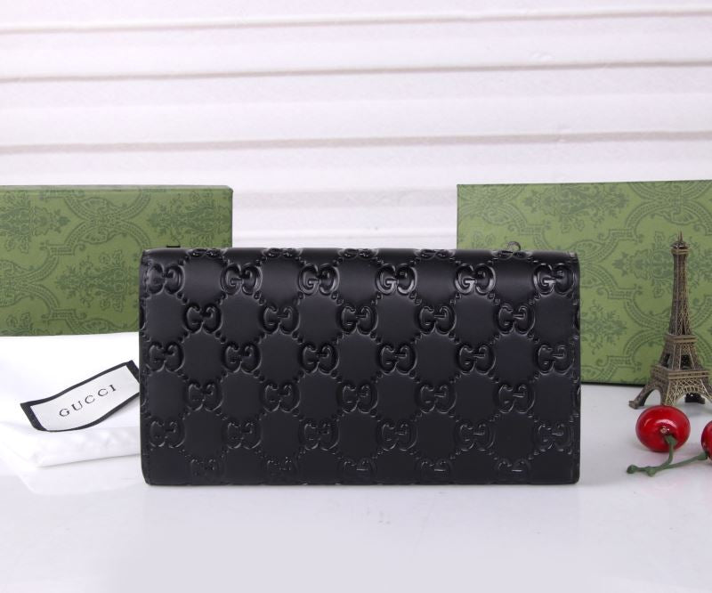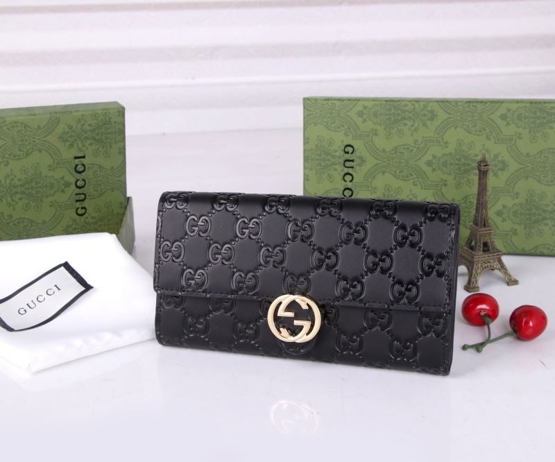 This compact Gucci wallet features embossed GG leather and the iconic gold GG logo hardware on the flap. It opens to reveal multiple card slots, a secure snap coin pocket, and bill compartments—perfect for staying organized in style.