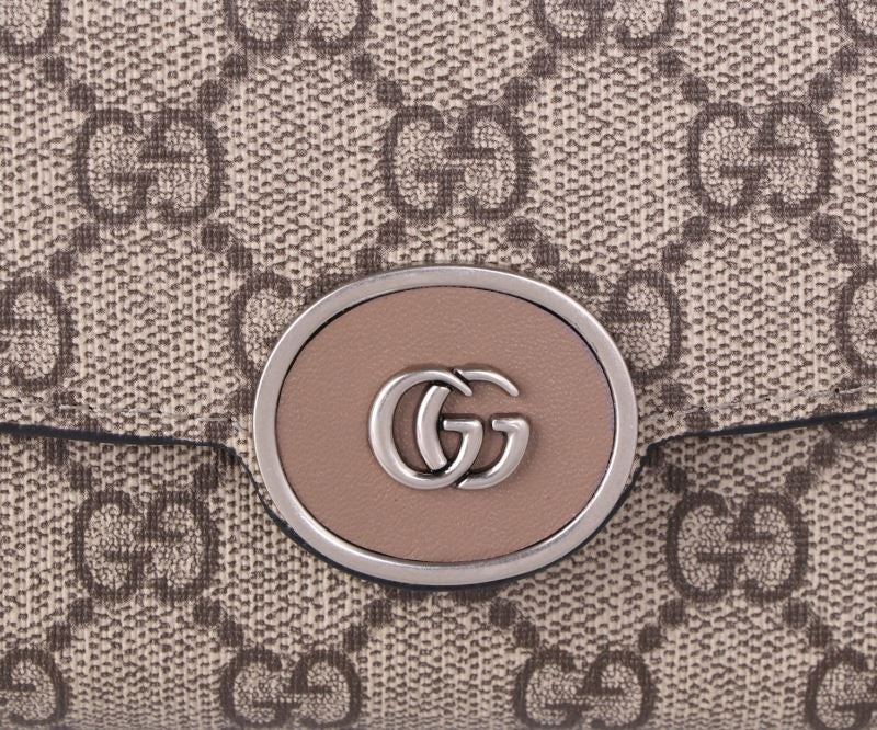 A compact yet chic wallet that’s perfect for everyday use. Features the iconic GG monogram canvas with a round logo clasp in a soft taupe tone. Inside offers organized space for cards, cash, and coins.