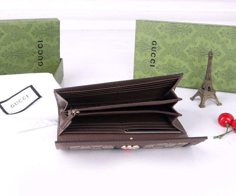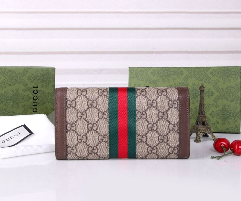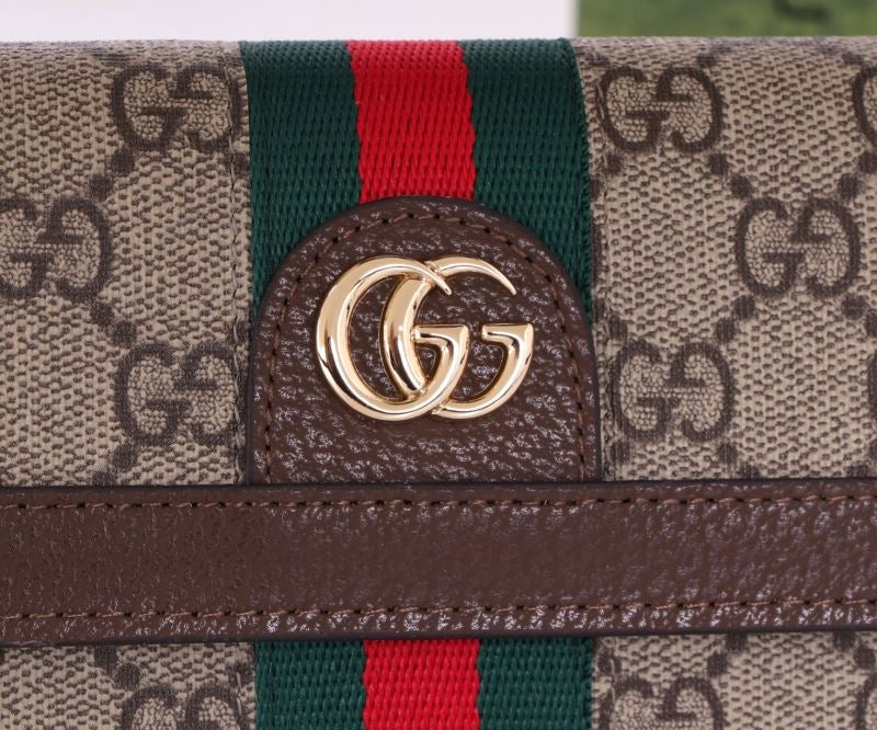 Features Gucci’s classic GG canvas design with bold red and green web stripe. Complete with gold GG logo and brown leather trim.