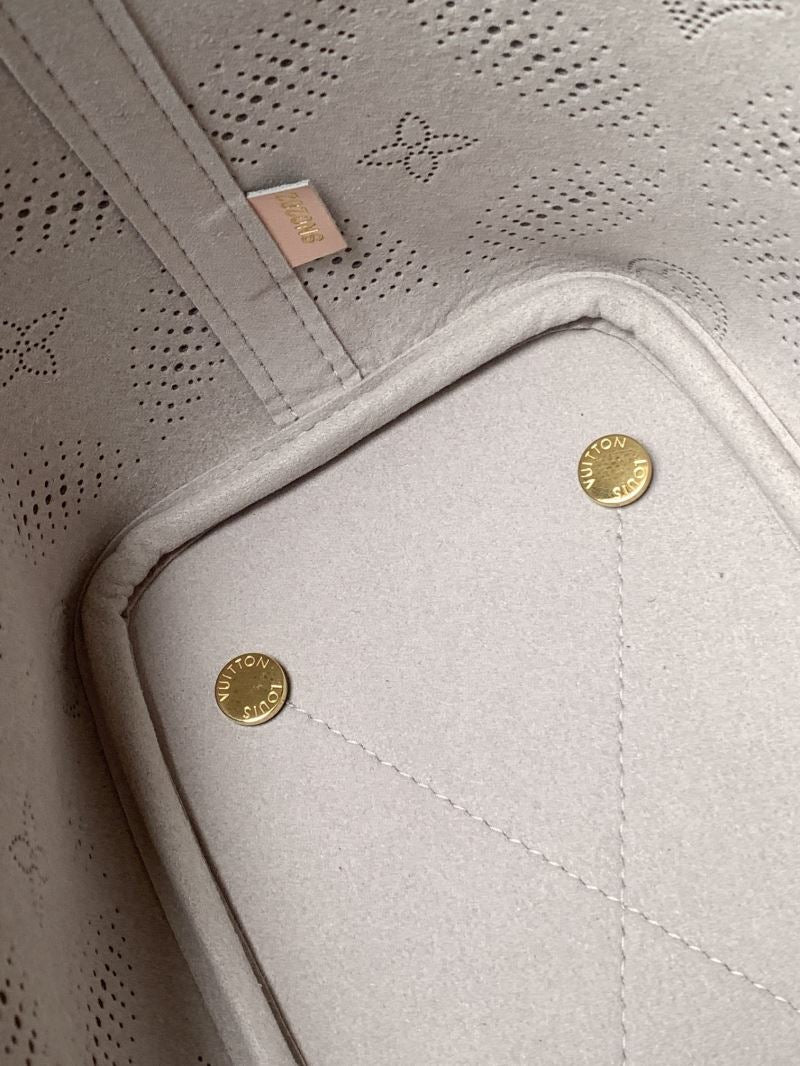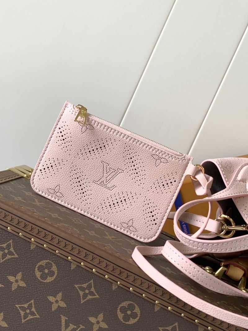 This Louis Vuitton Blossom PM is crafted in soft, perforated Mahina leather in a feminine light pink shade. The elegant silhouette features dual handles, a removable shoulder strap for crossbody or over-the-shoulder wear, and a round LV charm for a signature finish. Perfect for elevating any look with a soft luxury touch.