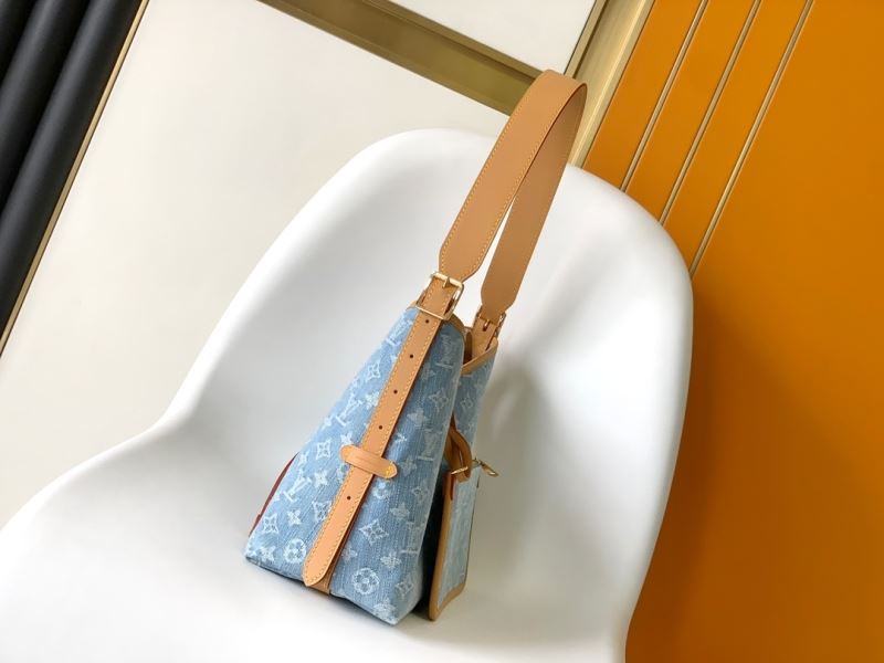 The Louis Vuitton CarryAll PM in blue monogram denim offers a relaxed yet refined everyday style. Crafted with signature denim canvas, natural leather trim, and an elegant slouchy silhouette, this bag is both stylish and functional. It features a removable zip pouch and wide shoulder strap for comfortable wear, plus a unique denim luggage tag detail that adds character.