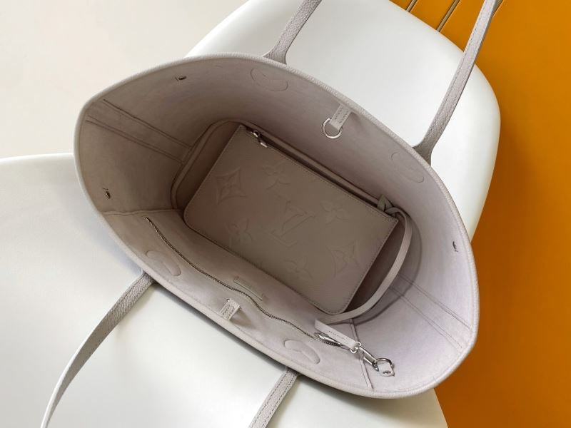 A timeless tote with a modern twist. This Neverfull MM features luxurious cream-colored Monogram embossed leather, offering a clean, elegant look that matches effortlessly with any outfit. Includes slim leather shoulder straps and a removable matching pouch for added functionality.