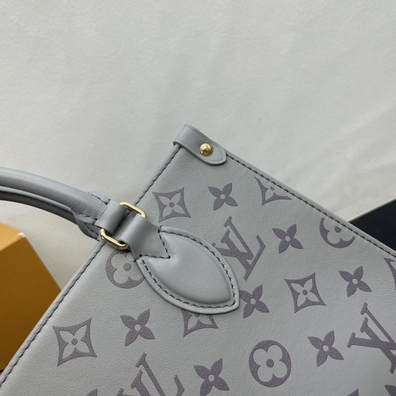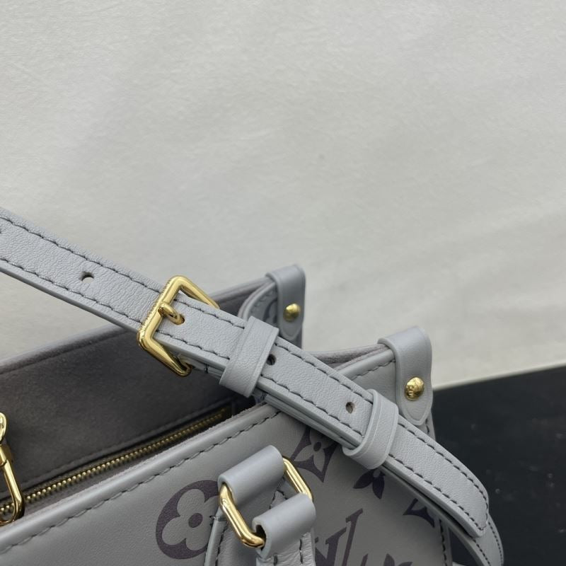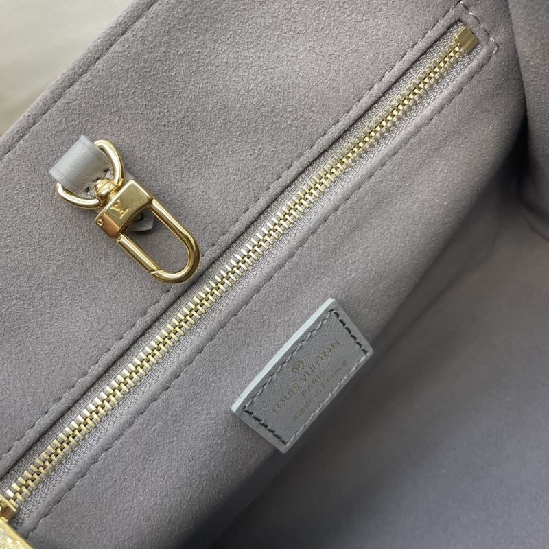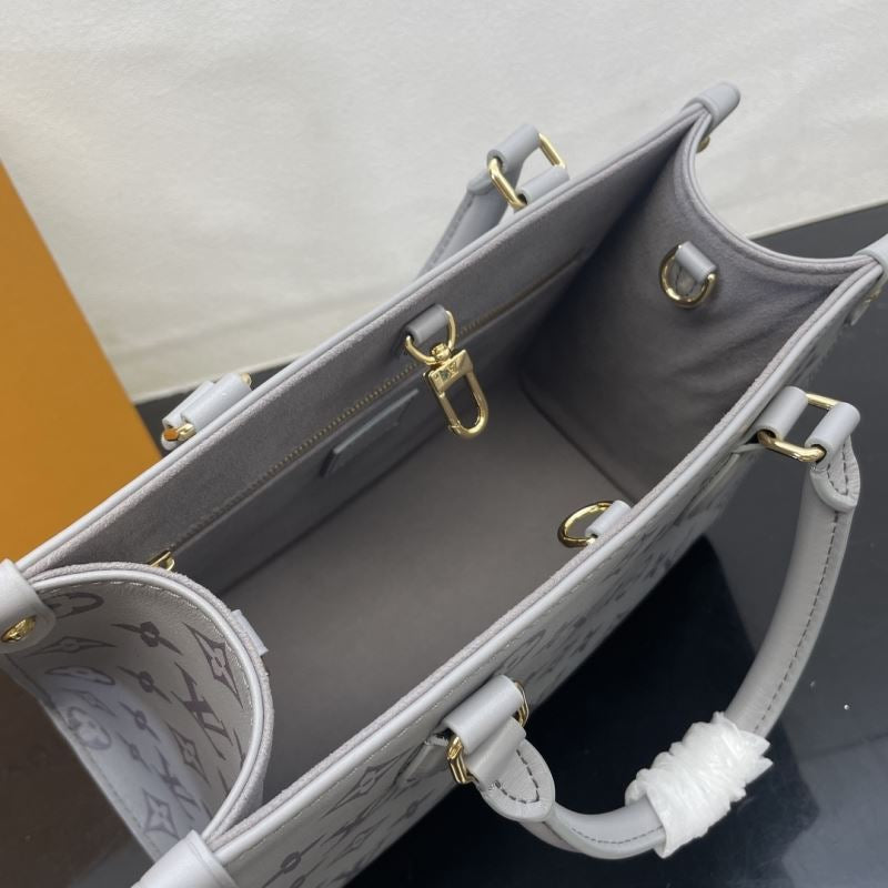 This stylish OnTheGo PM features the iconic Louis Vuitton Monogram canvas in a soft grey tone with top handles and a detachable strap for versatile wear. Its compact size makes it perfect for everyday essentials while maintaining a polished, luxury look.