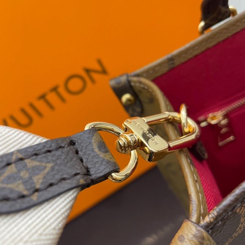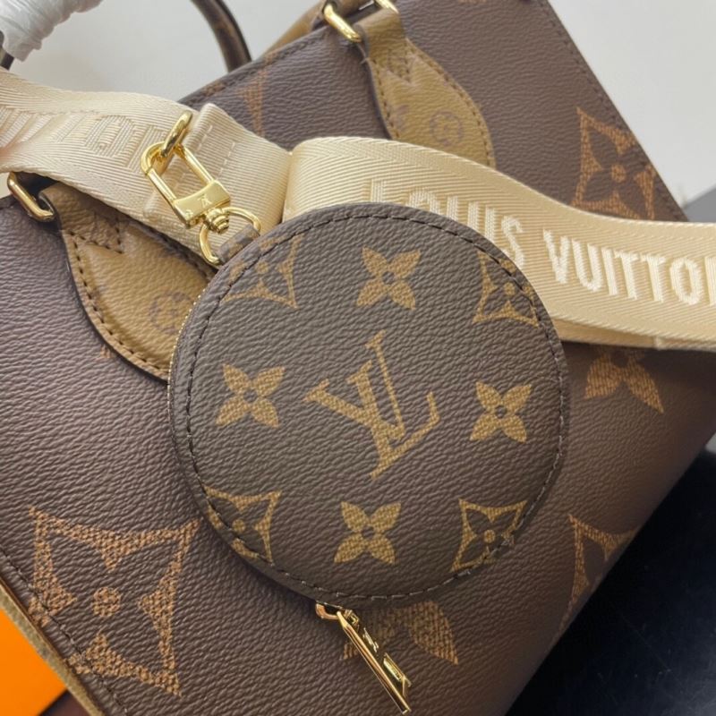 The OnTheGo PM is the perfect compact tote for everyday glam. Crafted in iconic Monogram canvas with natural leather trim, this version features a stylish detachable wide strap with “Louis Vuitton” embroidery and an adorable round coin purse for added flair. Carry it by hand or wear it crossbody for modern versatility.
