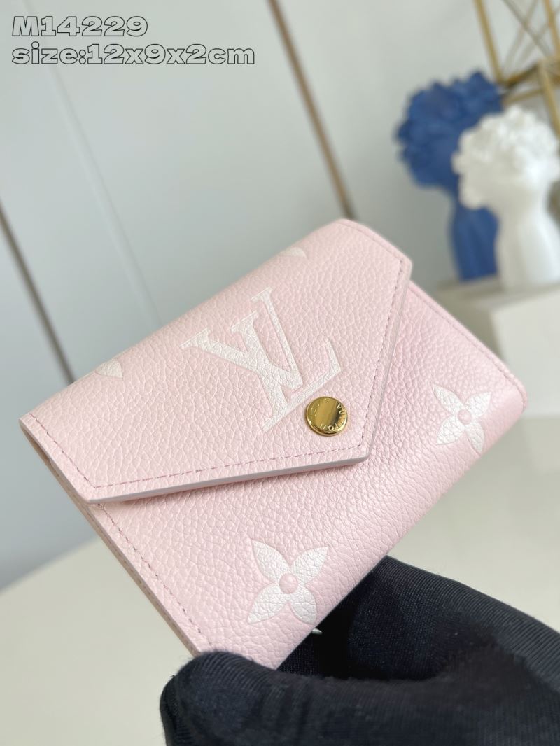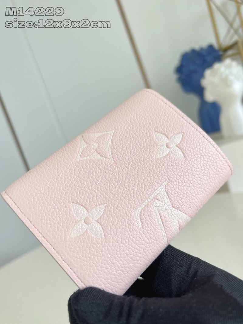 Crafted in soft pink textured leather with white embossed monogram, this Victorine wallet offers elegance in a compact size. It opens to reveal multiple card slots, a bill compartment, and a secure coin zip pocket — perfect for stylish everyday use.