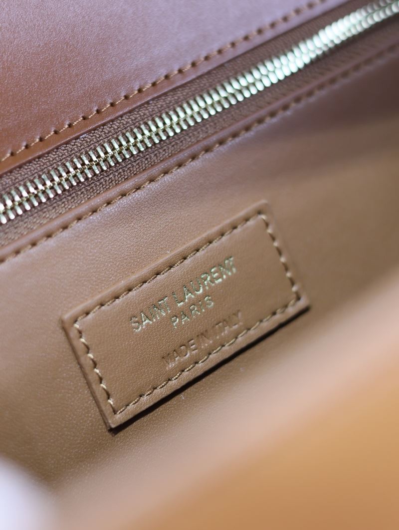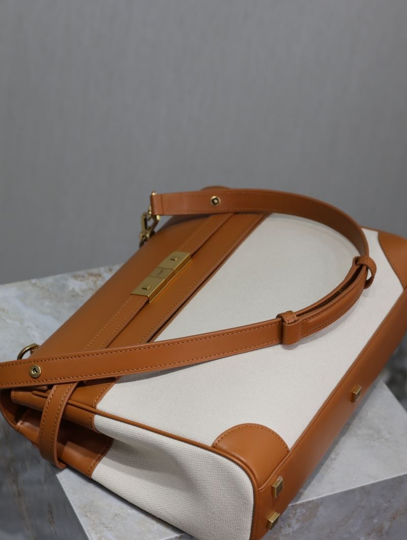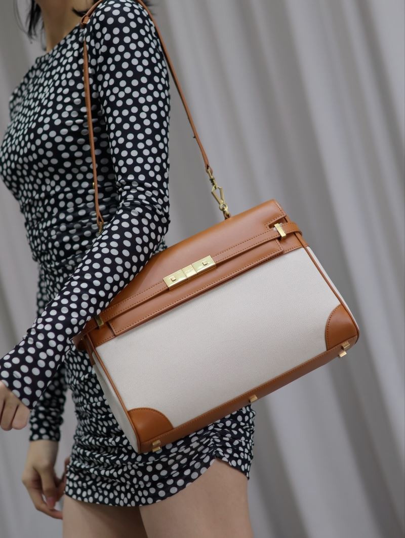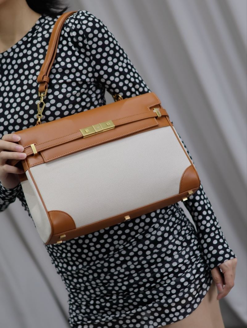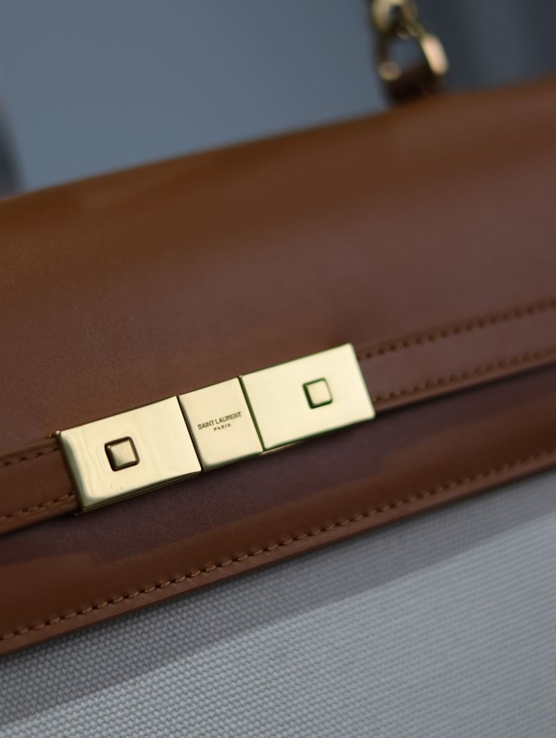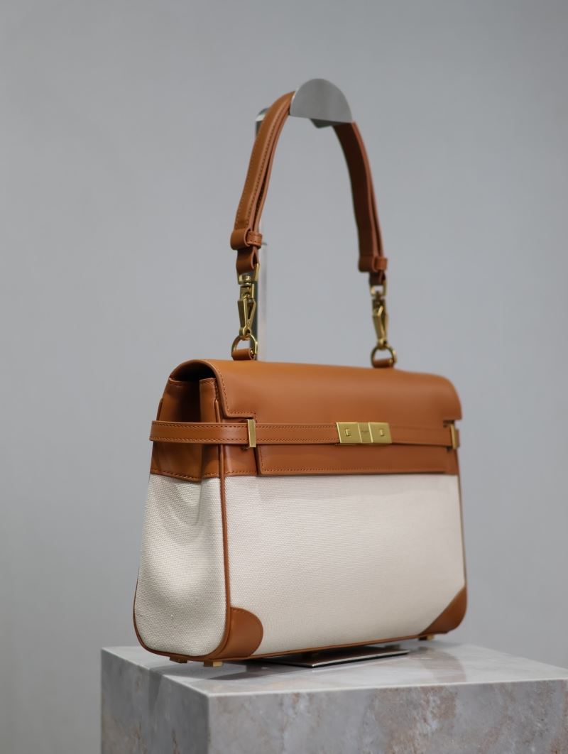 A sophisticated blend of structure and softness, the Saint Laurent Manhattan is crafted with smooth brown leather and natural canvas for a timeless contrast. This chic shoulder bag features gold-tone hardware, a top strap with clasp closure, and a clean, minimal silhouette. Spacious enough for your daily essentials while elevating any outfit.