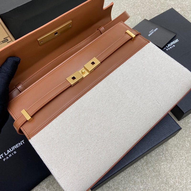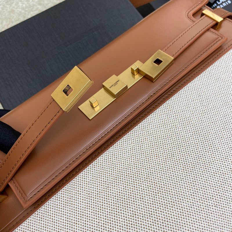 A refined and structured silhouette, the Saint Laurent Manhattan Medium Bag is the perfect blend of Parisian elegance and everyday versatility. Crafted in durable beige canvas with rich brown leather trim, this statement piece is finished with minimalist gold-tone hardware and a signature clasp closure. The interior is spacious enough to carry your daily essentials while remaining sleek and compact for both casual and formal styling.