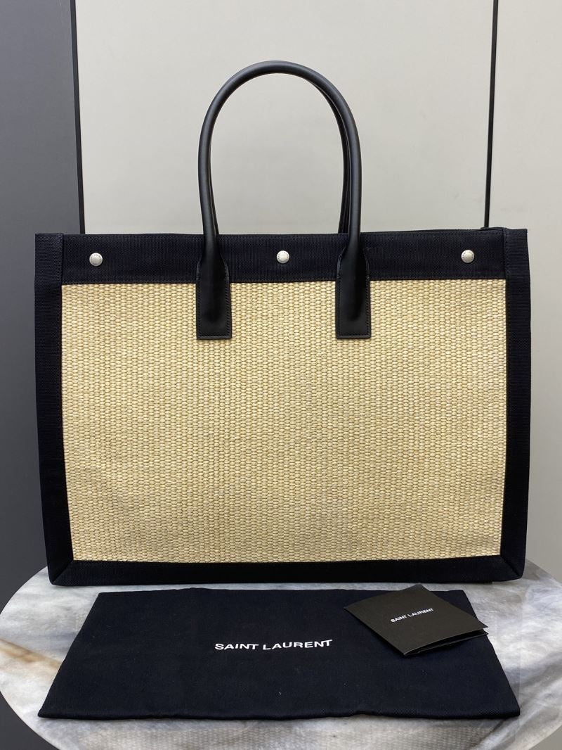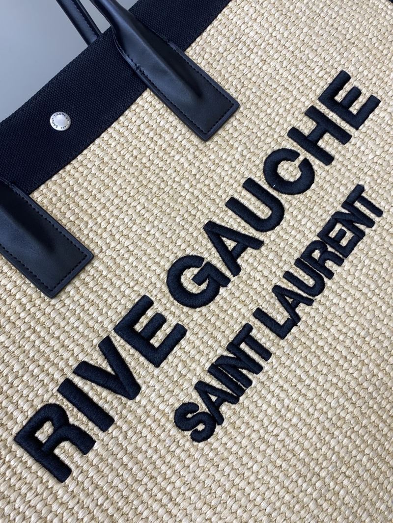 Elevate your summer look with this chic Saint Laurent Rive Gauche Tote, crafted from a natural straw-textured weave and framed in black canvas. The bold black “RIVE GAUCHE” embroidery and SAINT LAURENT branding give it that iconic designer touch.