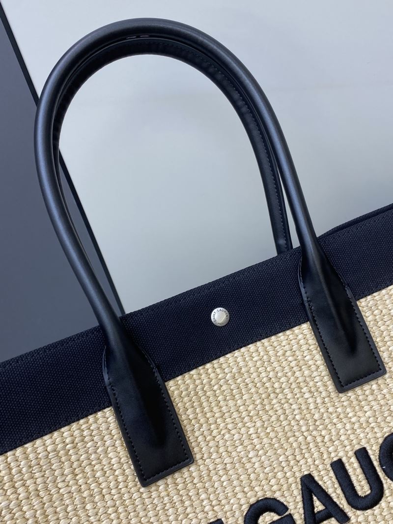 🧵 Material: Straw-style woven fabric with black canvas trim and leather handles