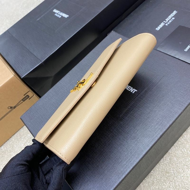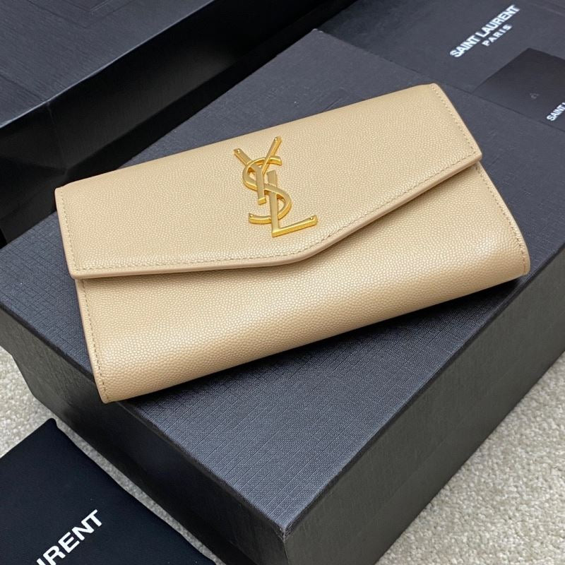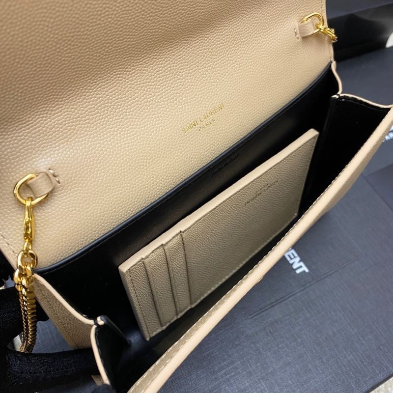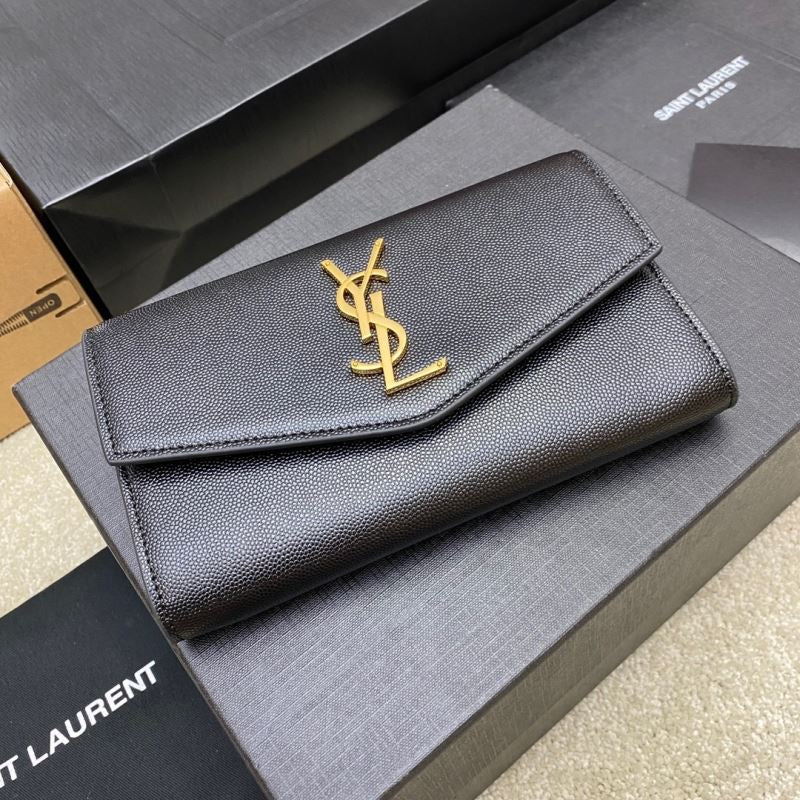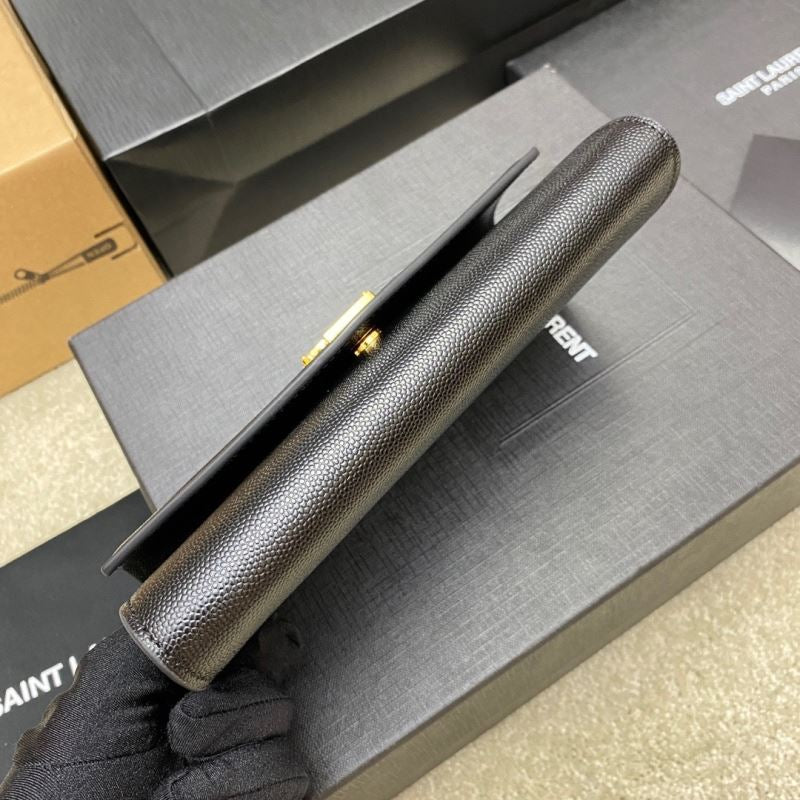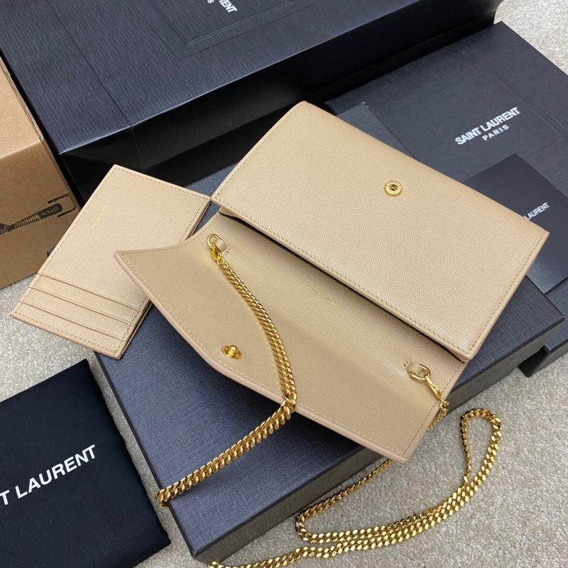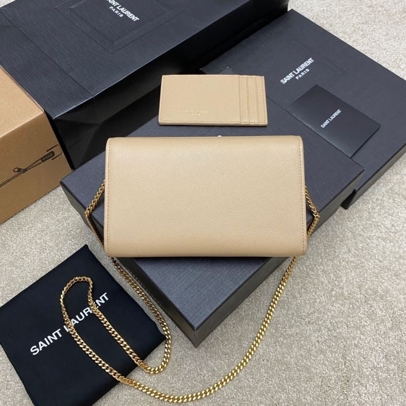 Details: Features an elegant flap closure with iconic gold YSL logo, detachable chain strap, and matching cardholder included. Perfect for both day and evening wear.
