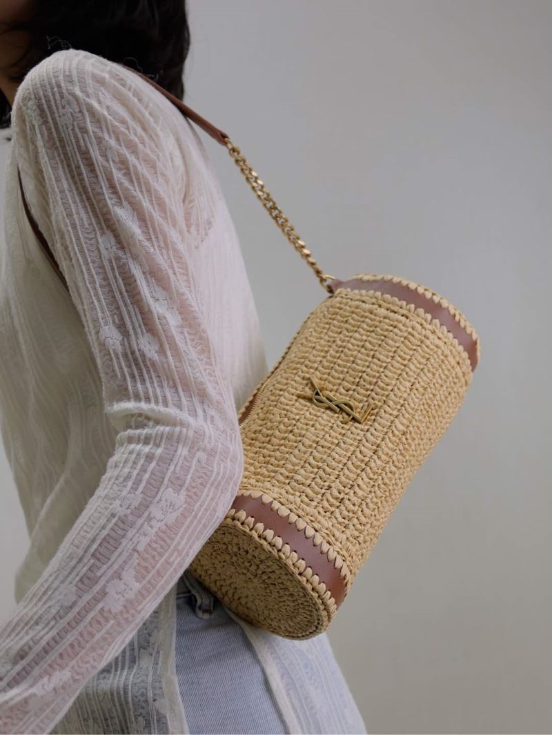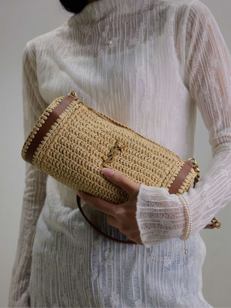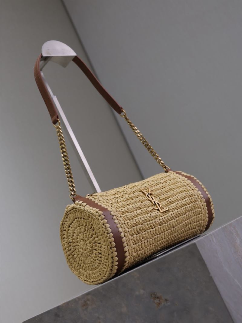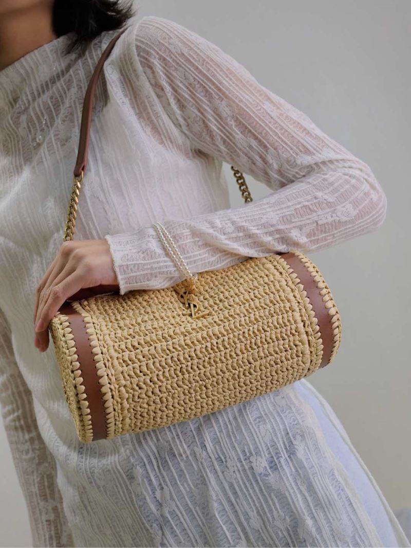 This unique barrel-style YSL shoulder bag is crafted in beige crochet raffia with rich brown leather trim and chain accents. A modern boho-luxe piece for everyday chic.