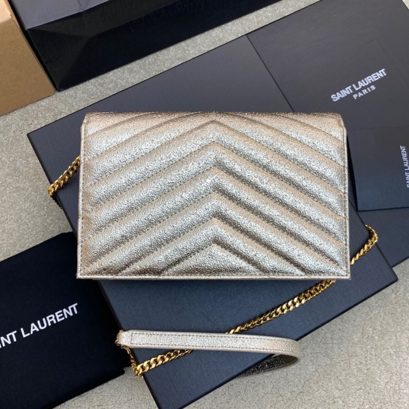 Turn heads with this dazzling YSL Envelope Wallet on Chain in metallic gold. Designed with signature chevron quilting and finished with the iconic YSL logo, it’s a glamorous choice for parties and formal occasions.