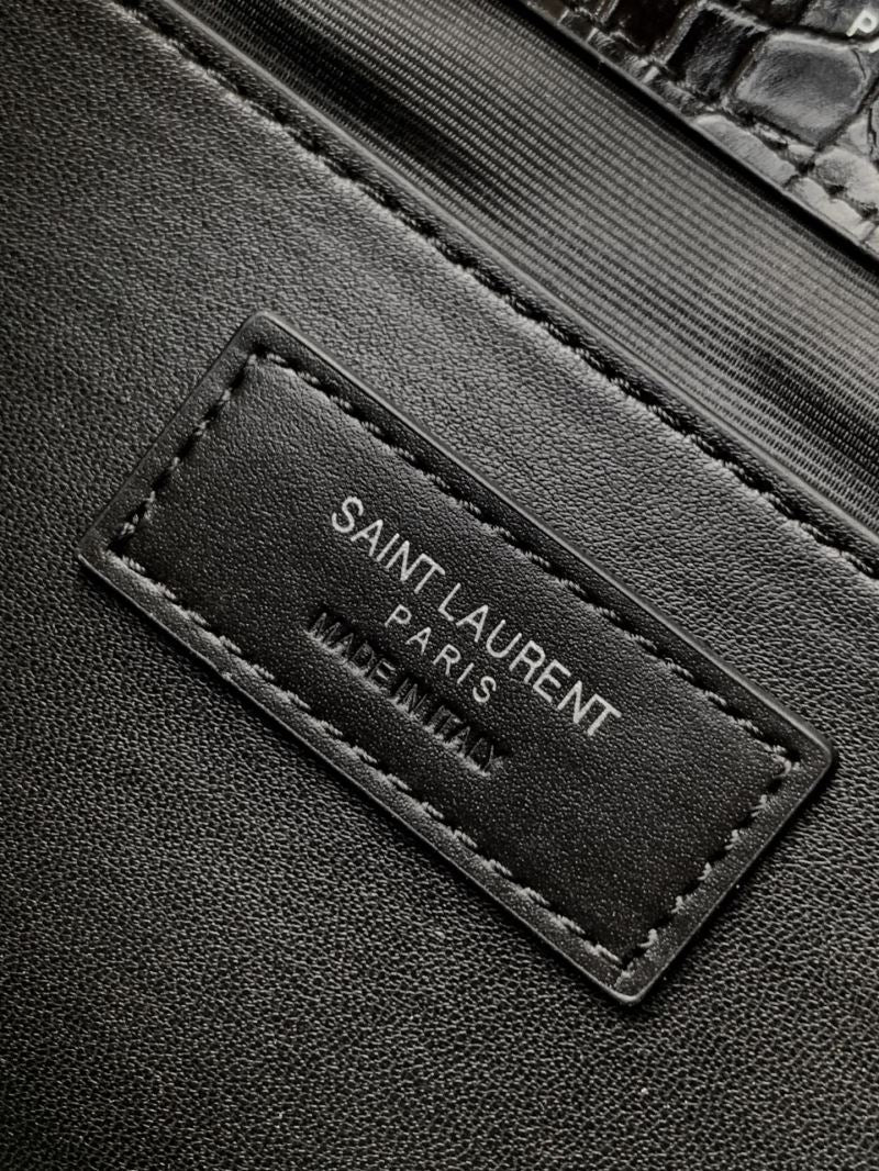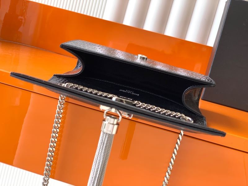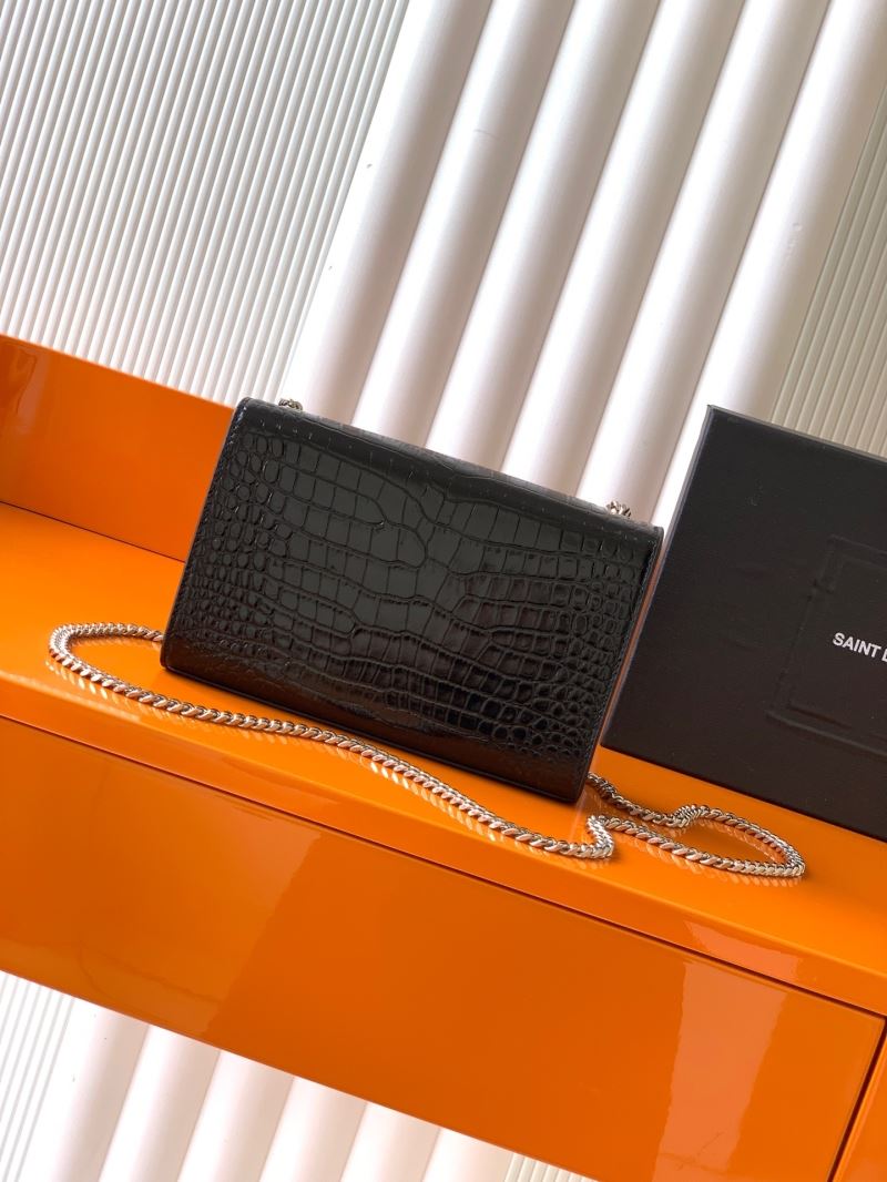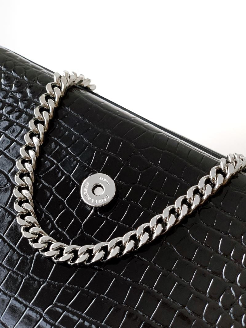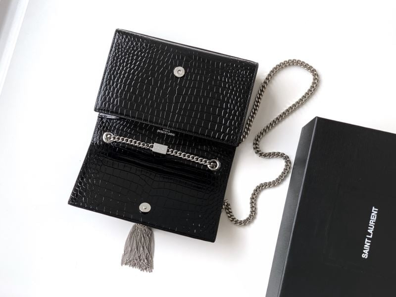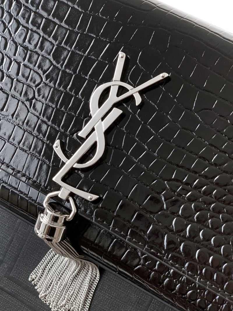 Make a bold statement with this elegant YSL Kate bag, featuring a sleek black croc-embossed finish and silver YSL monogram with a chic tassel accent. Its compact design and structured shape make it perfect for both day and night. Includes a matching silver chain strap that can be worn crossbody or on the shoulder.