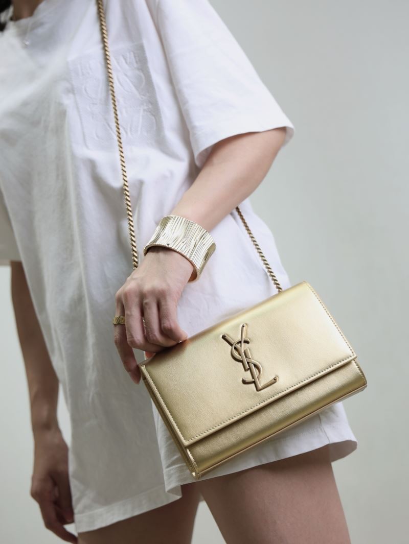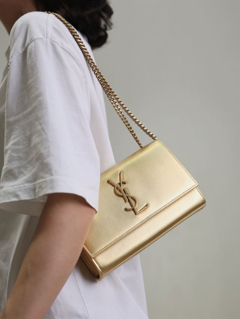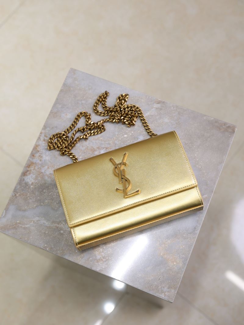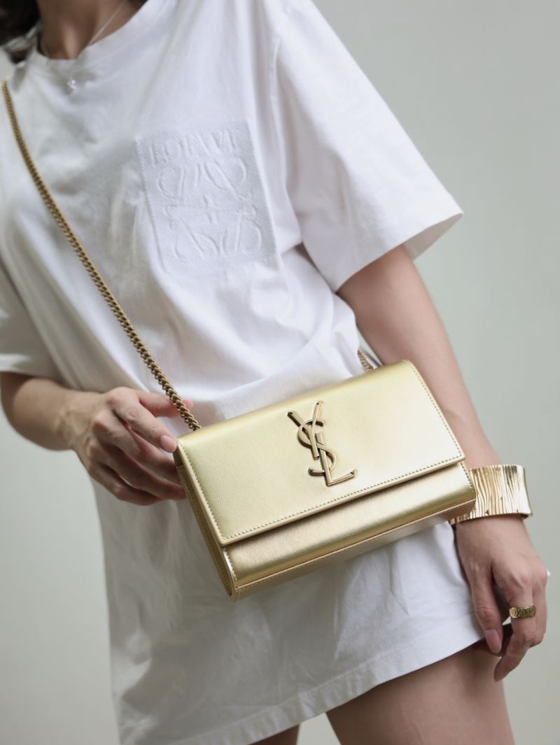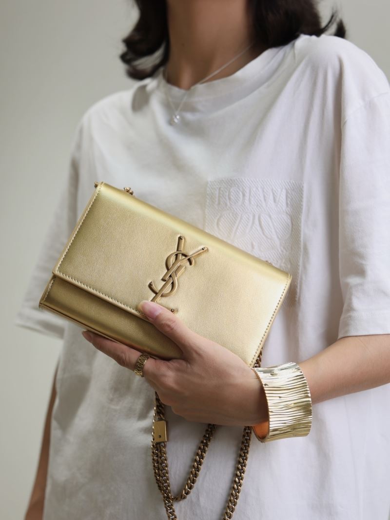 Make a bold statement with the YSL Kate in radiant metallic gold – a showstopping piece that combines timeless sophistication with a glamorous edge. This luxury chain bag features the signature YSL monogram in matching gold-tone hardware, sleek magnetic flap closure, and an elegant structured silhouette.