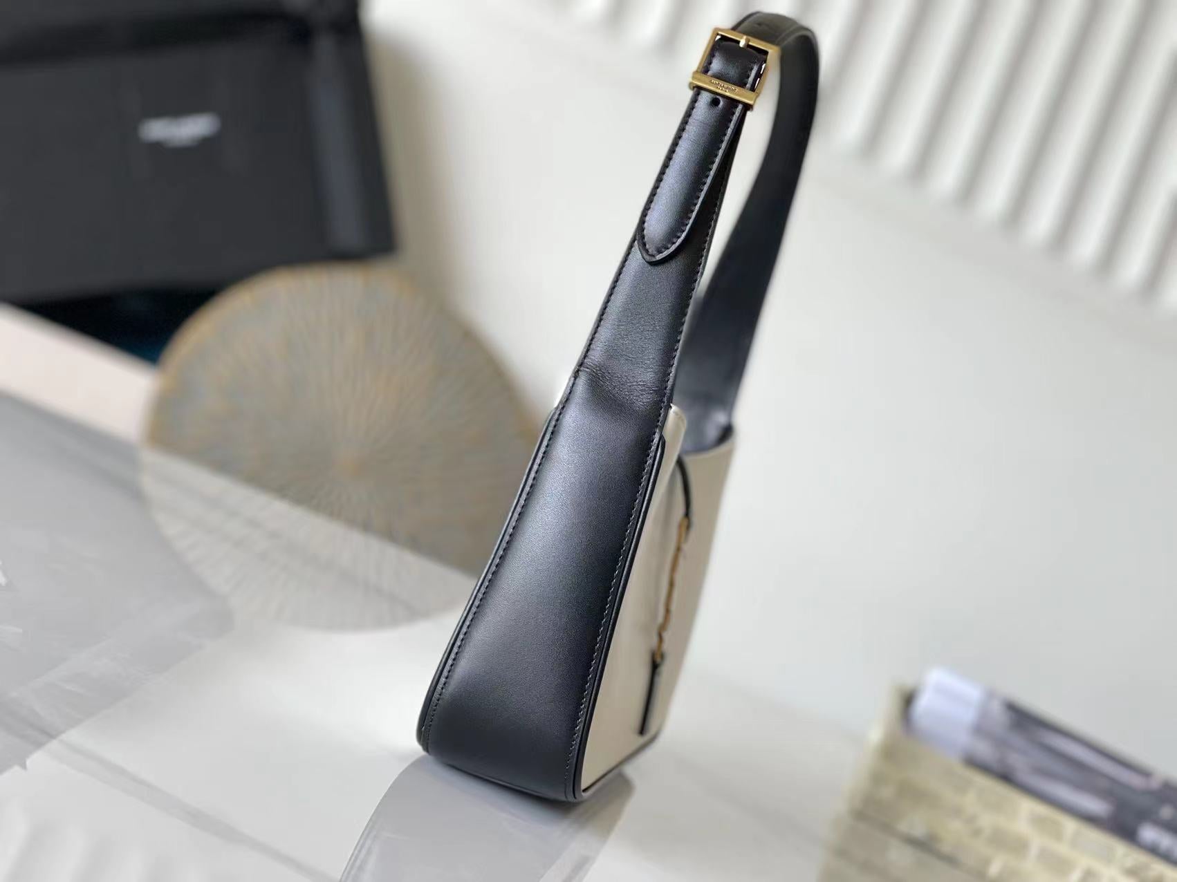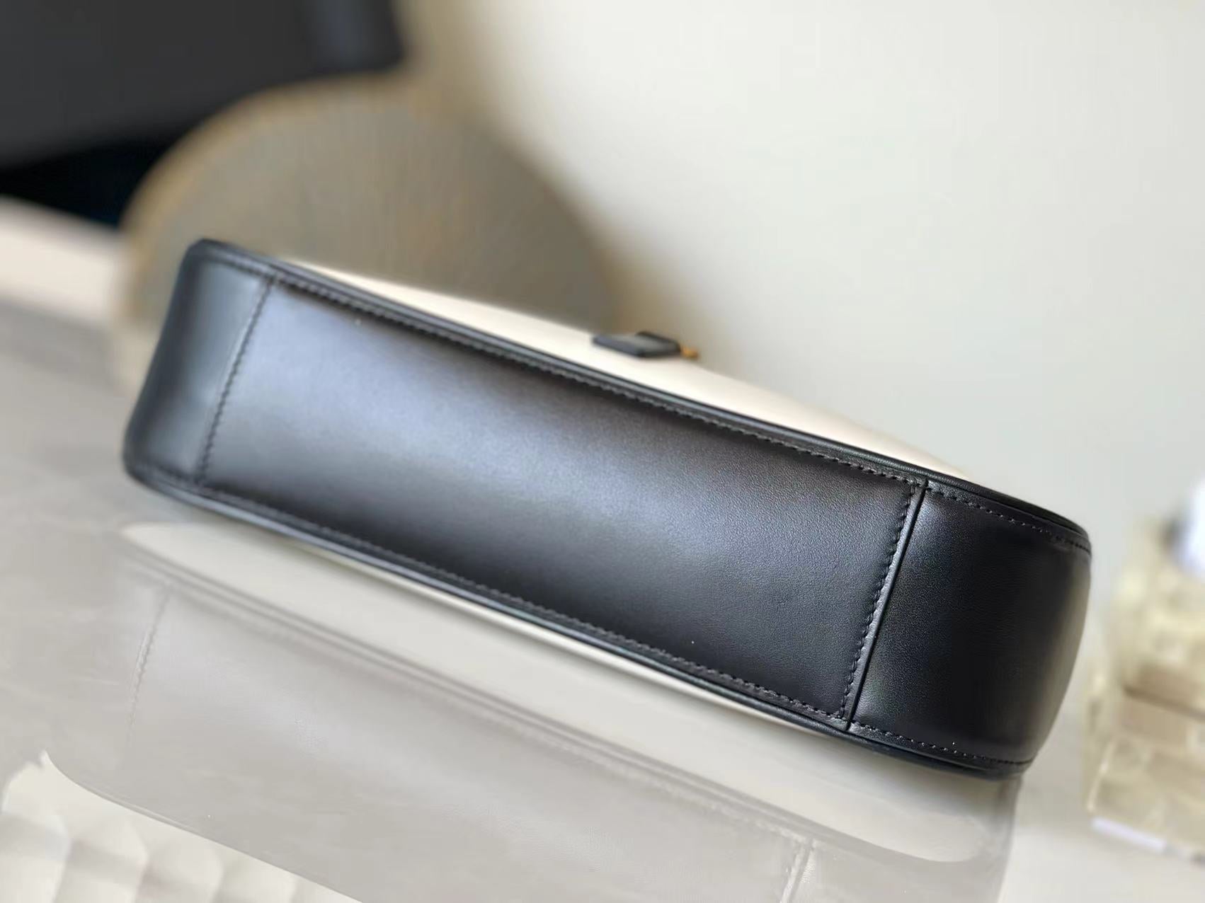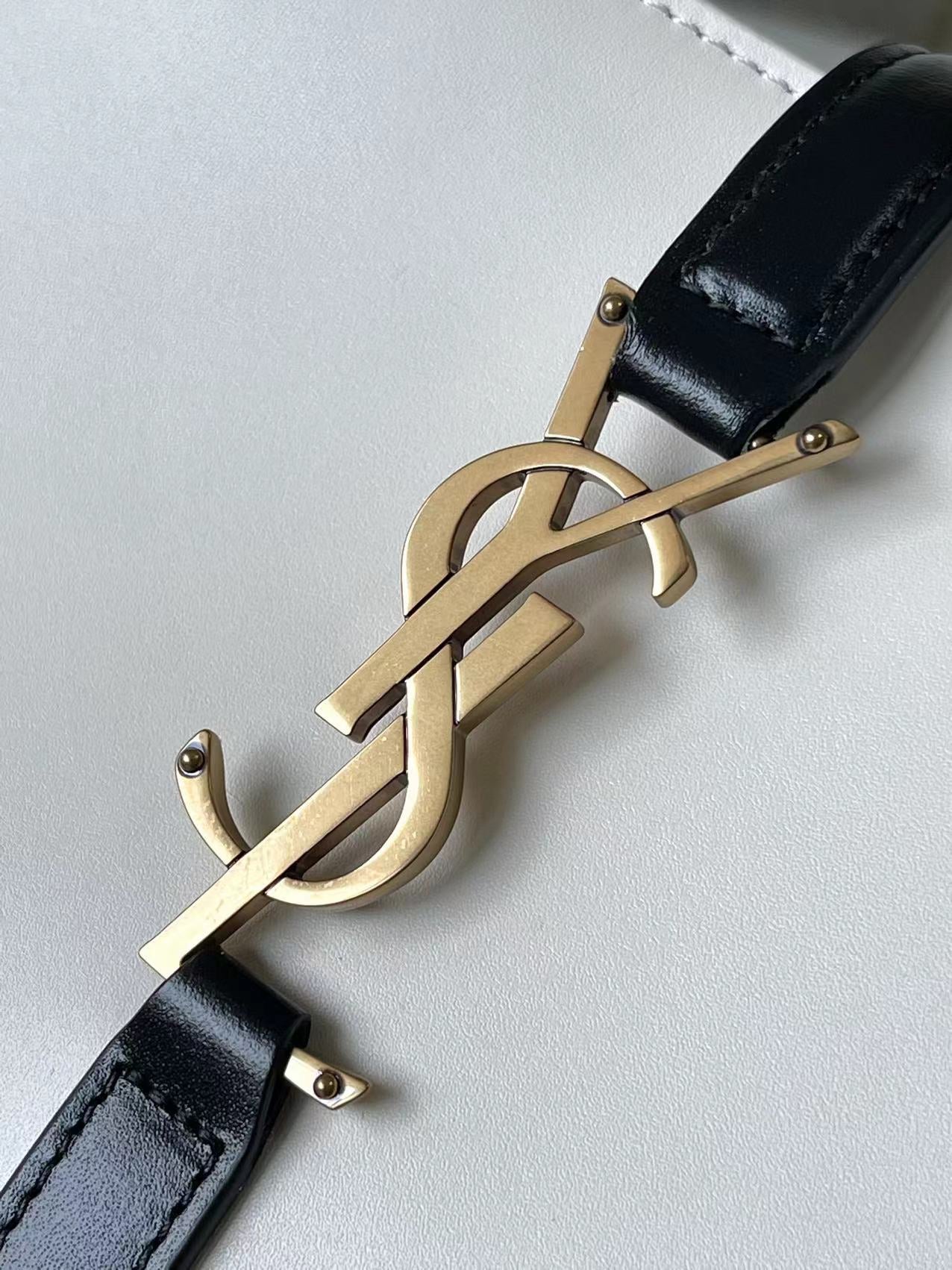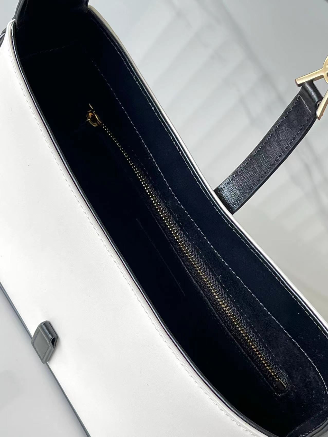 A sleek and minimal shoulder bag inspired by the iconic YSL Le 5 À 7 silhouette. This elegant replica features a glossy white body accented with black leather trim, finished with a bold gold YSL logo at the front. The structured design, curved lines, and adjustable strap make it perfect for both day and evening wear.