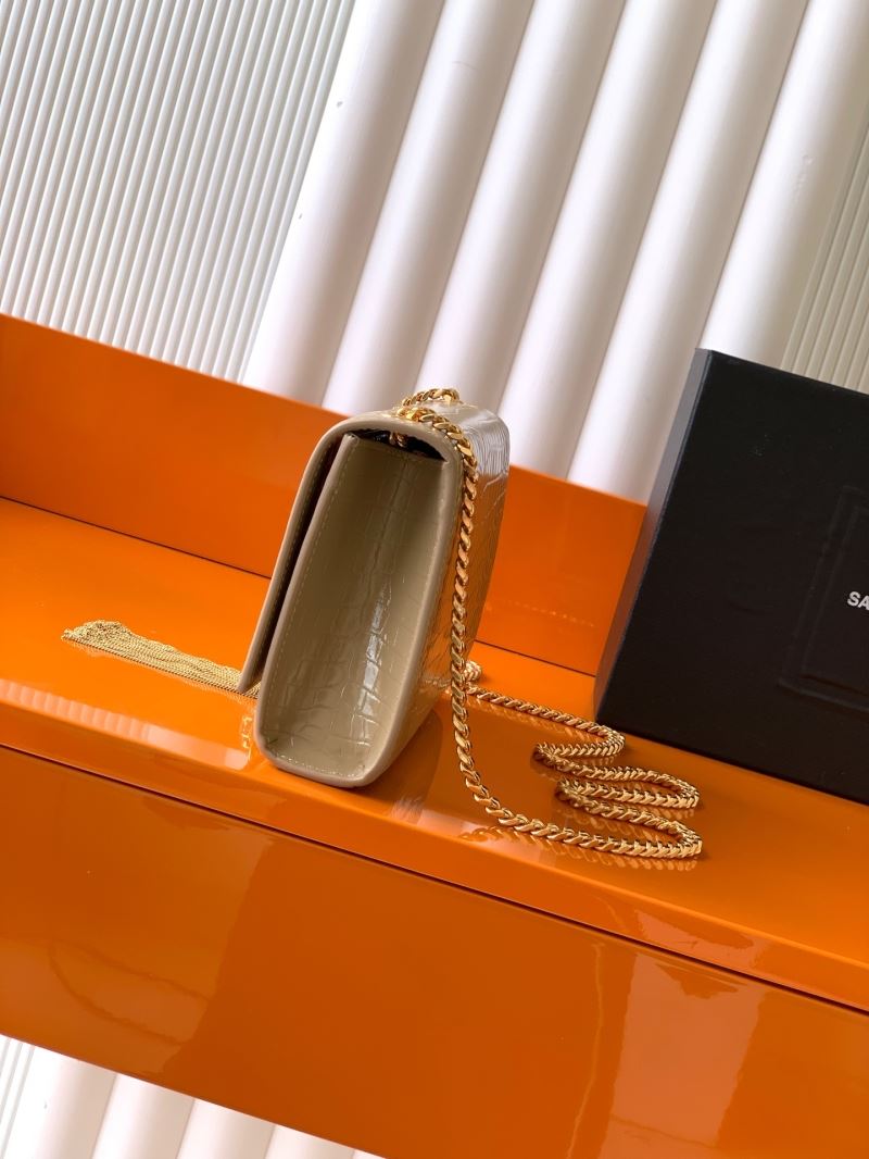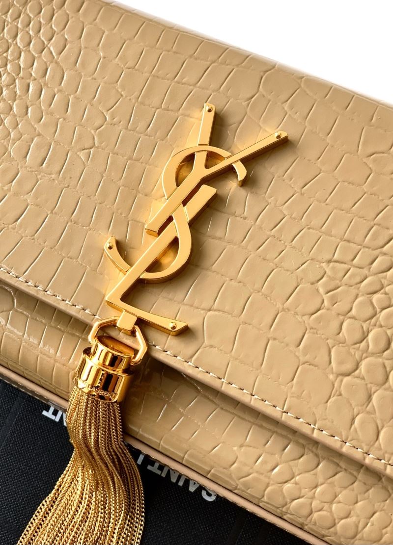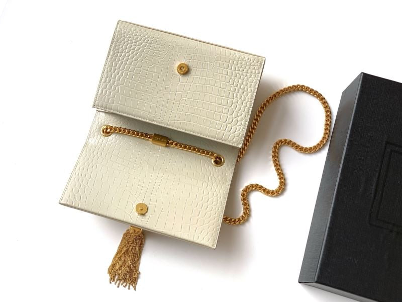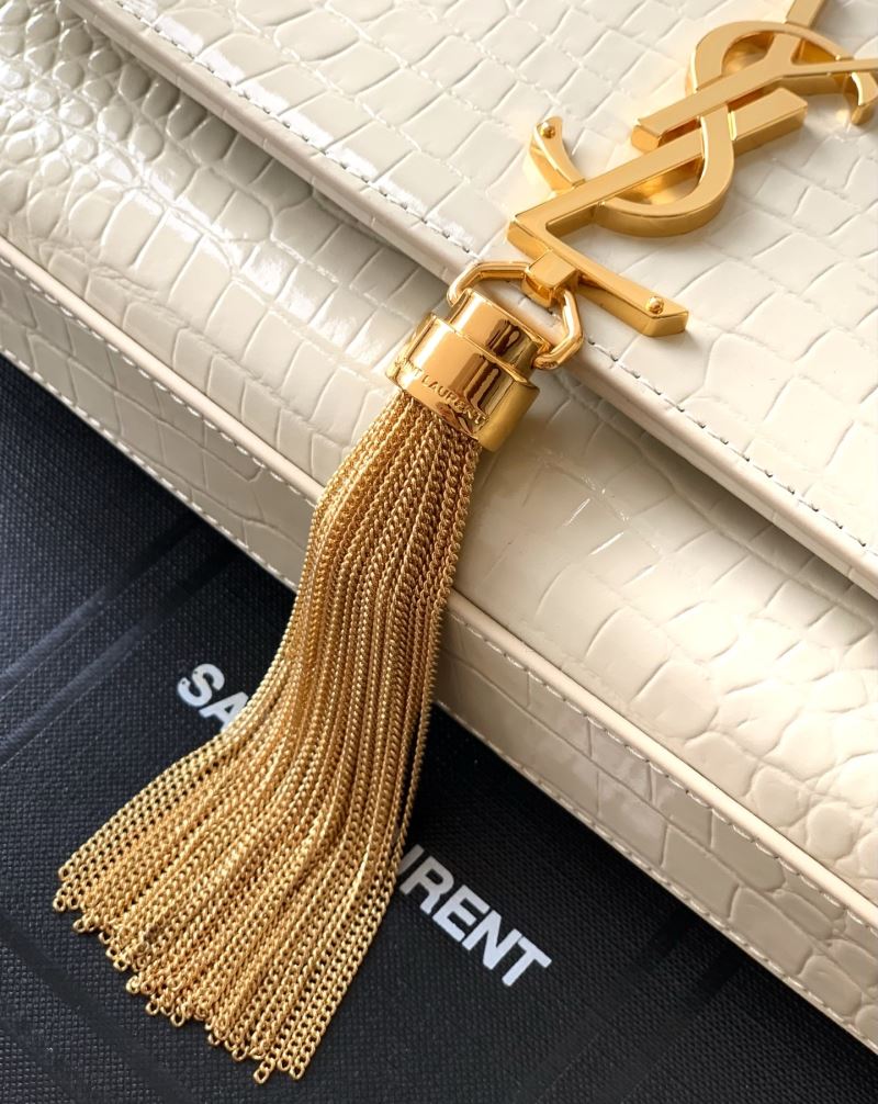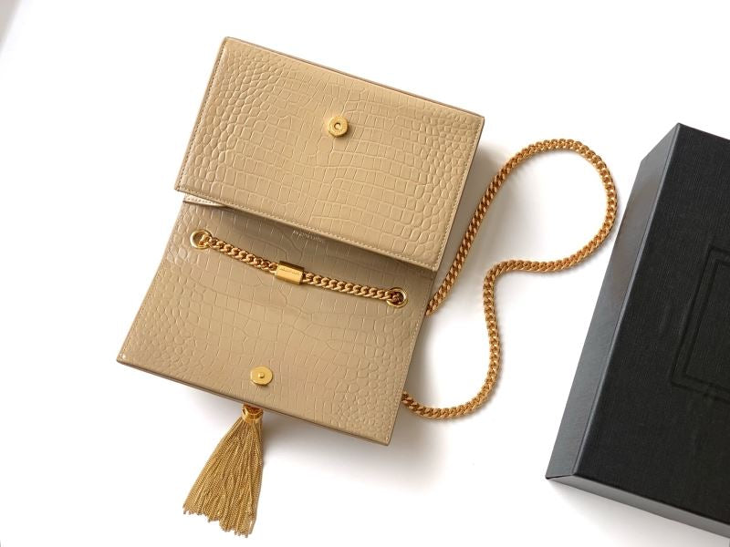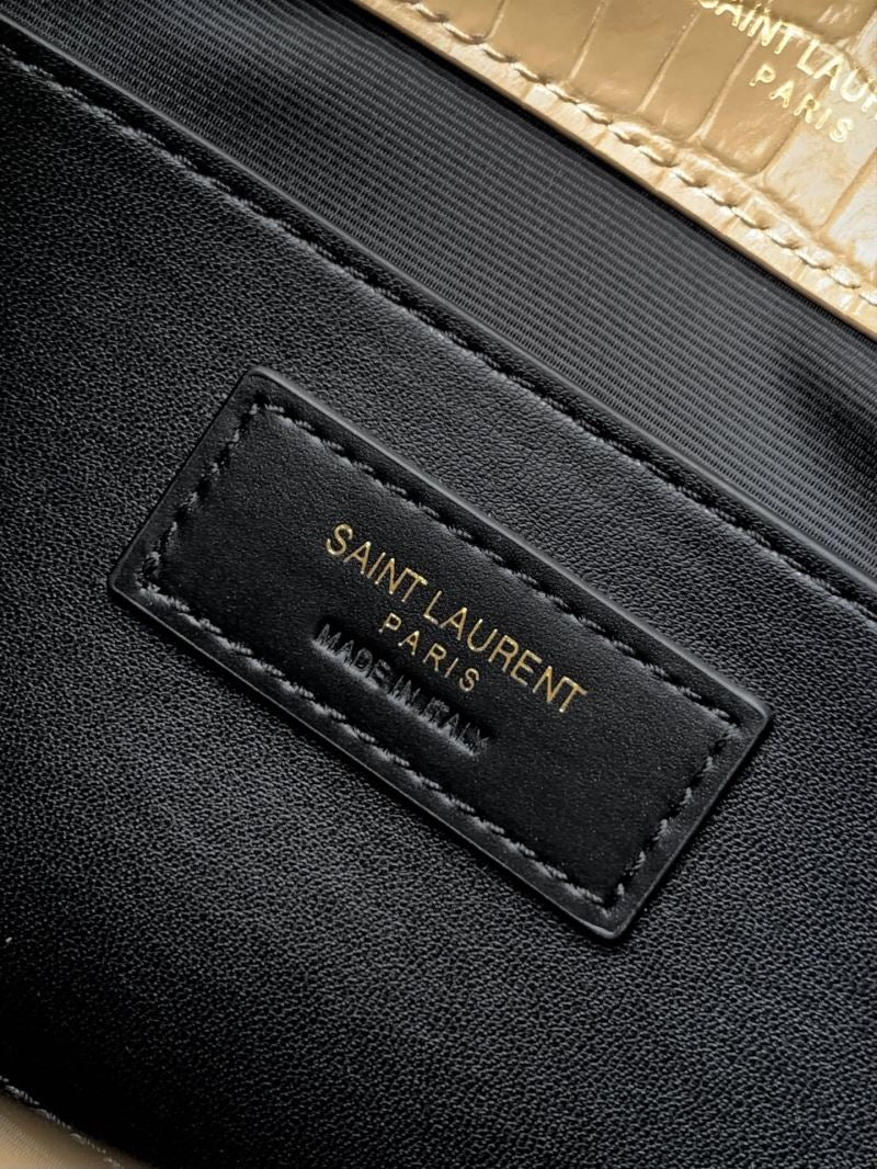 This elegant YSL LouLou bag features a luxurious crocodile-embossed texture, a structured silhouette, and gold-tone hardware with a signature YSL logo and statement tassel. Designed with a detachable chain strap, this piece transitions effortlessly from shoulder bag to clutch.