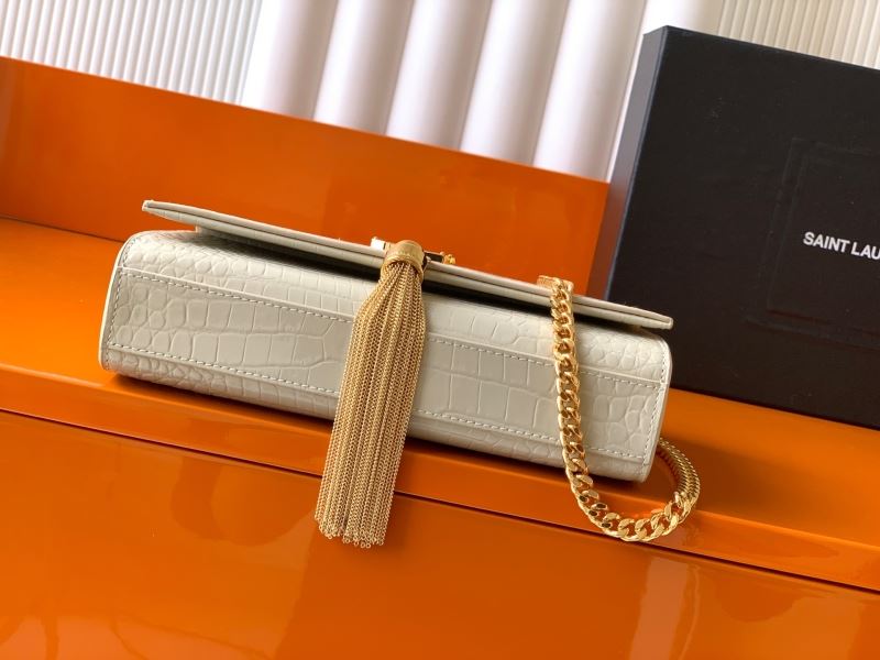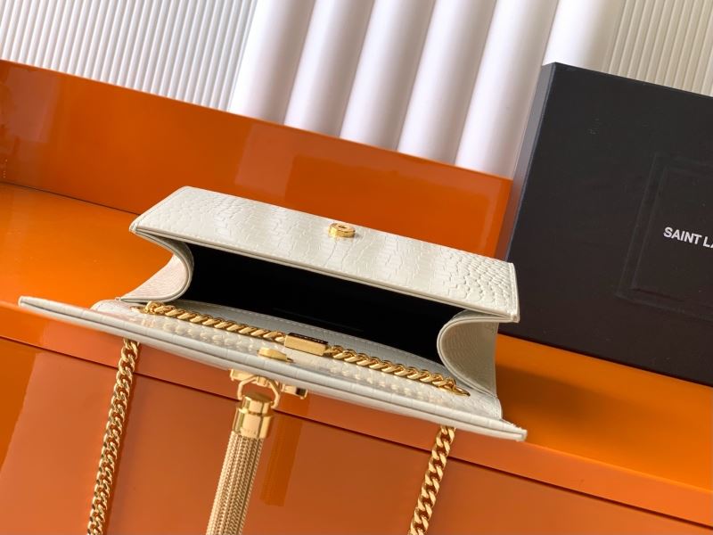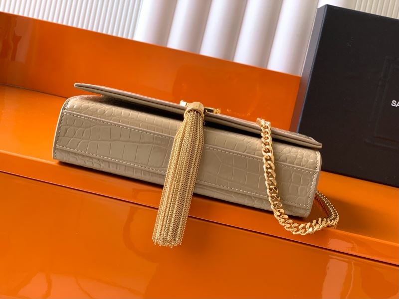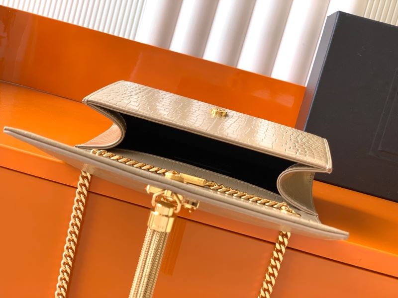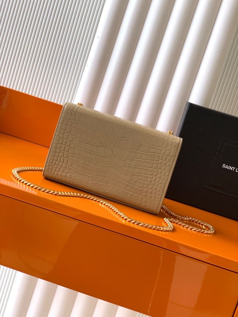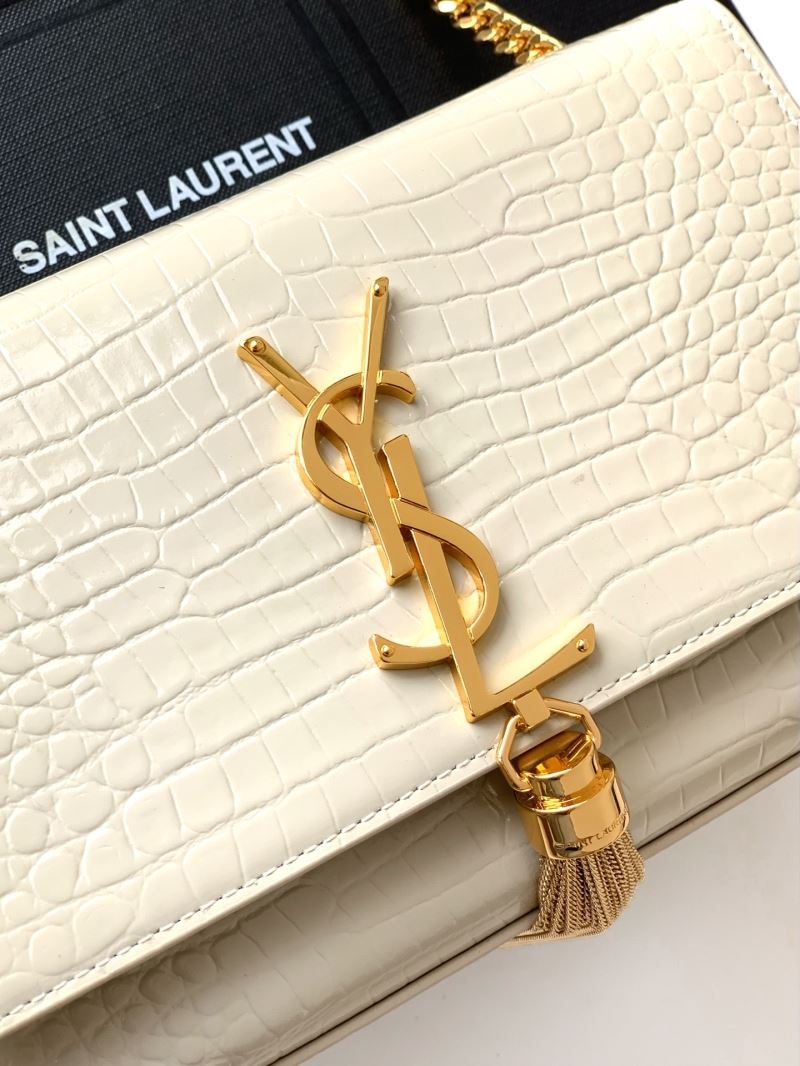 This elegant YSL LouLou bag features a luxurious crocodile-embossed texture, a structured silhouette, and gold-tone hardware with a signature YSL logo and statement tassel. Designed with a detachable chain strap, this piece transitions effortlessly from shoulder bag to clutch.