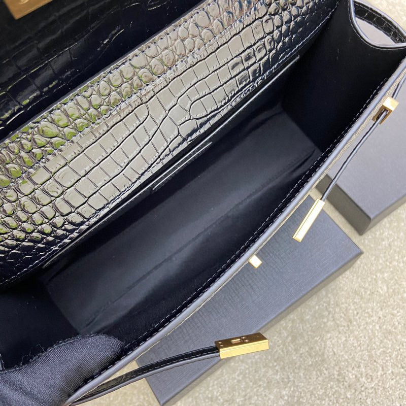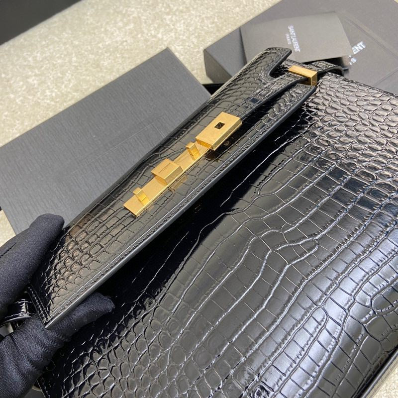 This sleek and structured Manhattan Baguette Bag is the epitome of refined elegance. Crafted in glossy black croc-embossed leather with signature gold-tone hardware, this YSL-inspired piece adds a polished edge to any outfit. The clean lines, top flap, and adjustable strap offer a versatile design perfect for both casual and formal occasions.