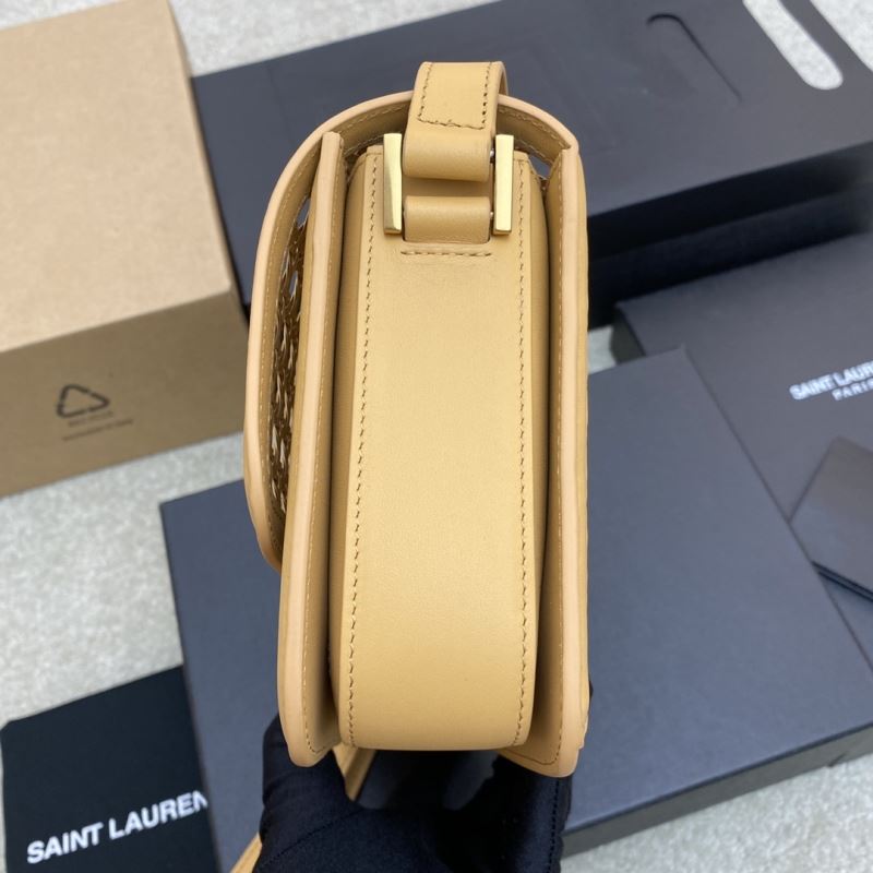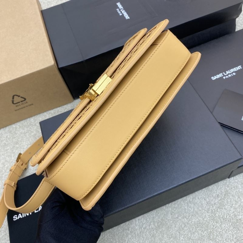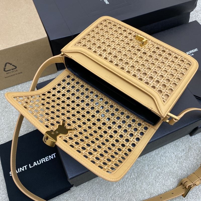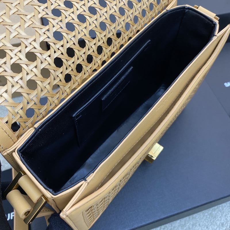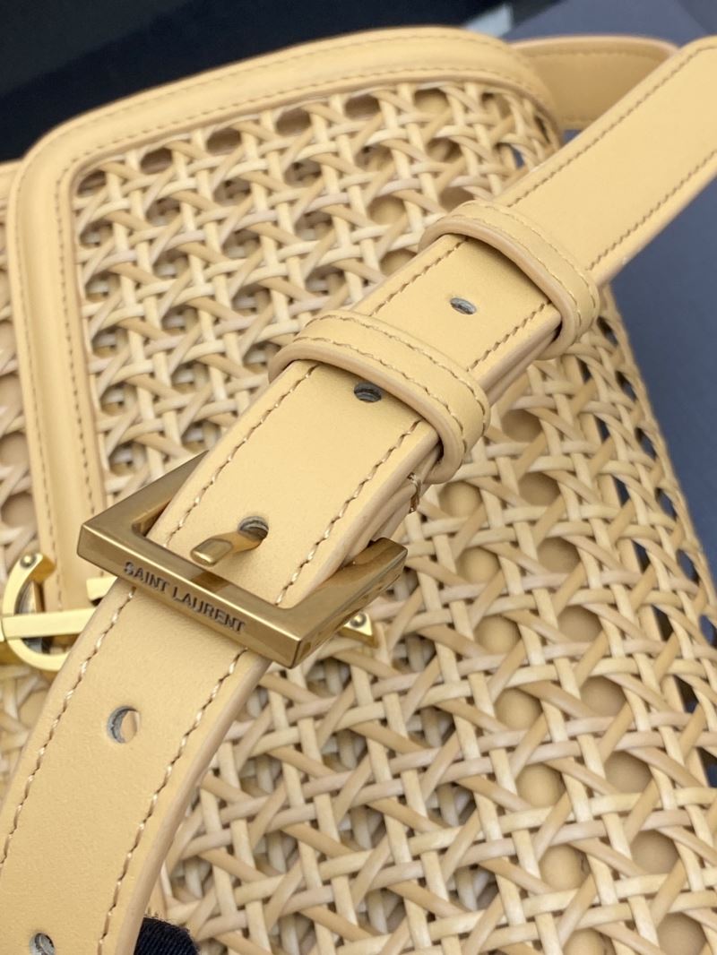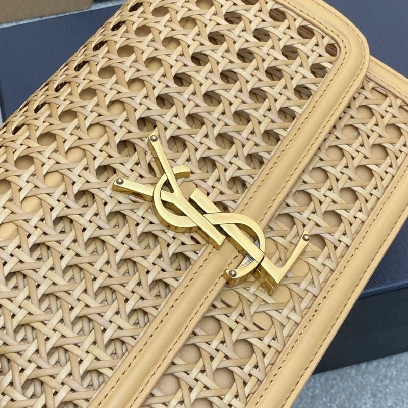 Introducing a stunning twist on the classic YSL Kate bag – this unique version features an elegant cane-weave rattan front panel paired with tan leather trim and gold YSL monogram hardware. The structured silhouette and adjustable leather strap make it perfect for crossbody or shoulder wear, offering a chic, resort-inspired vibe.