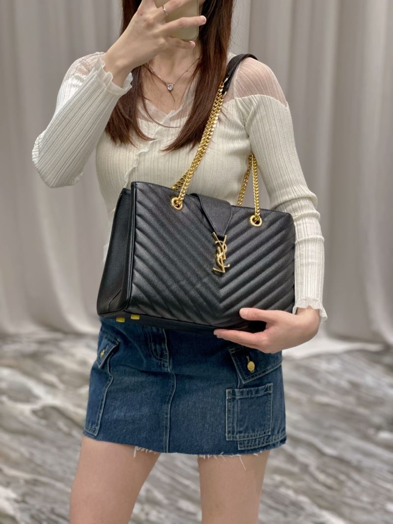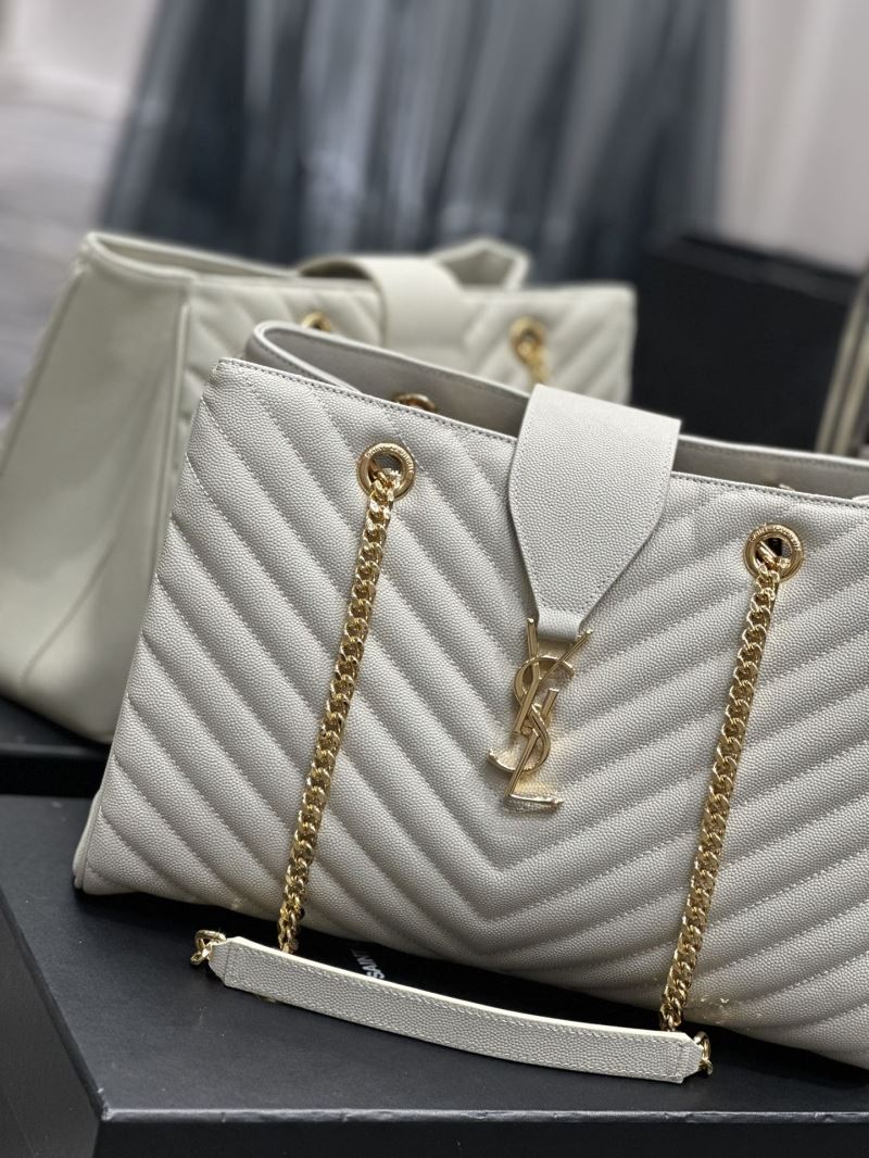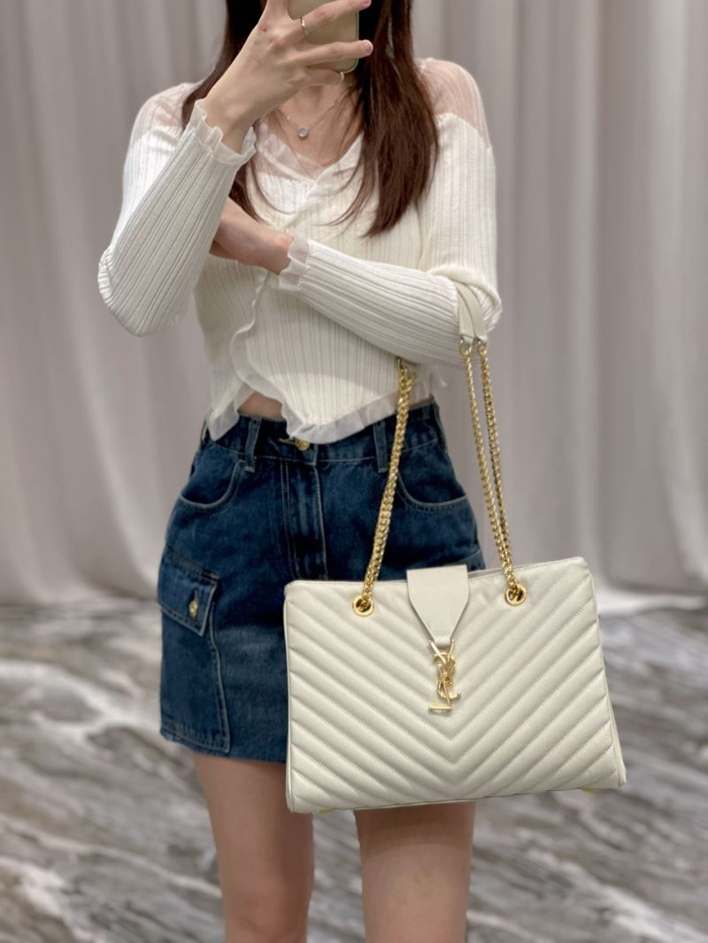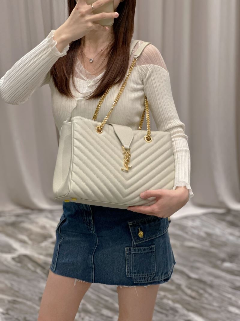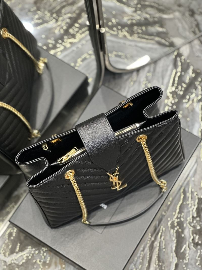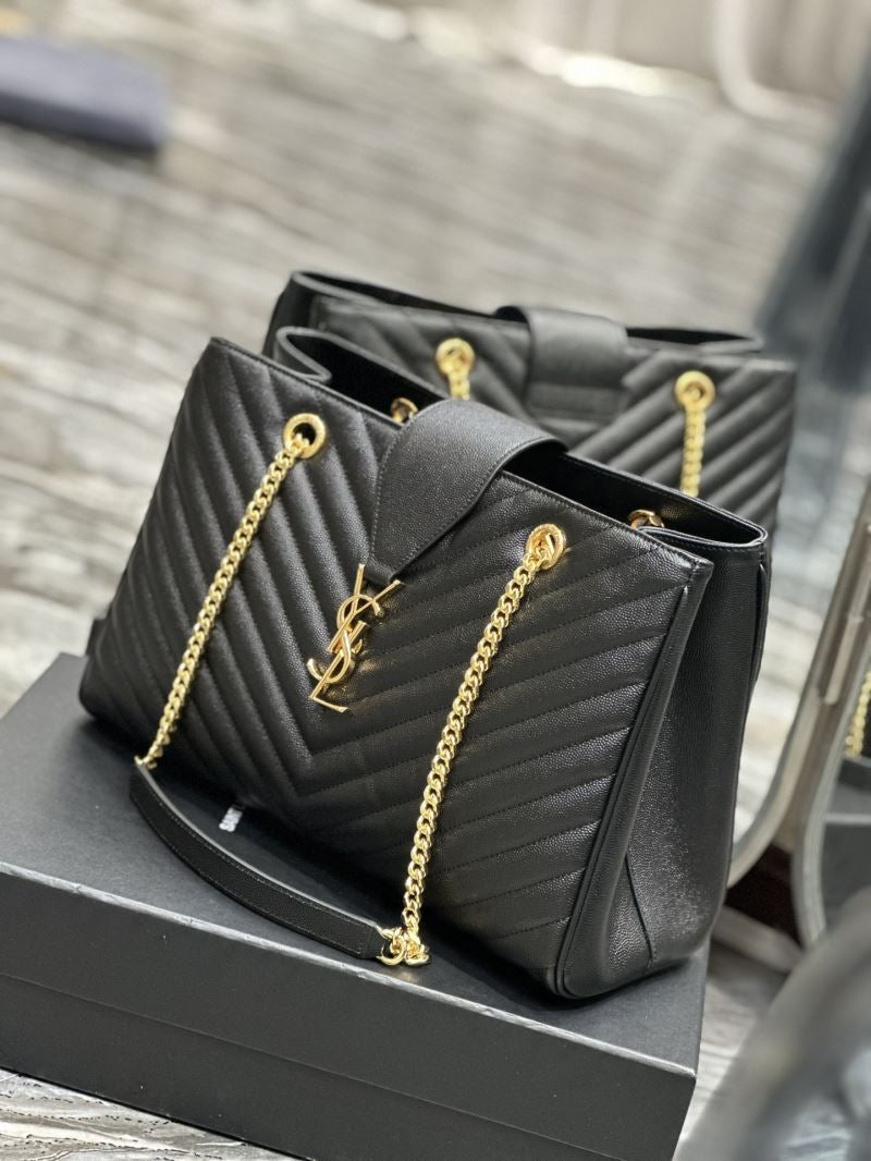 Elevate any outfit with this elegant quilted tote bag, featuring the iconic YSL gold logo and chain strap detailing. Its structured silhouette and luxe finish make it perfect for both day and night wear.