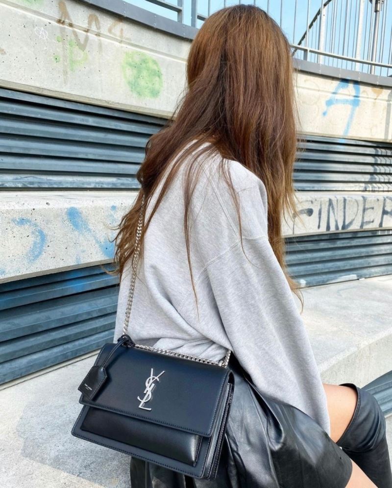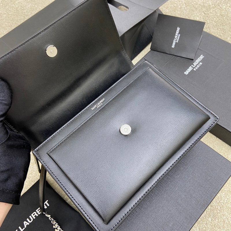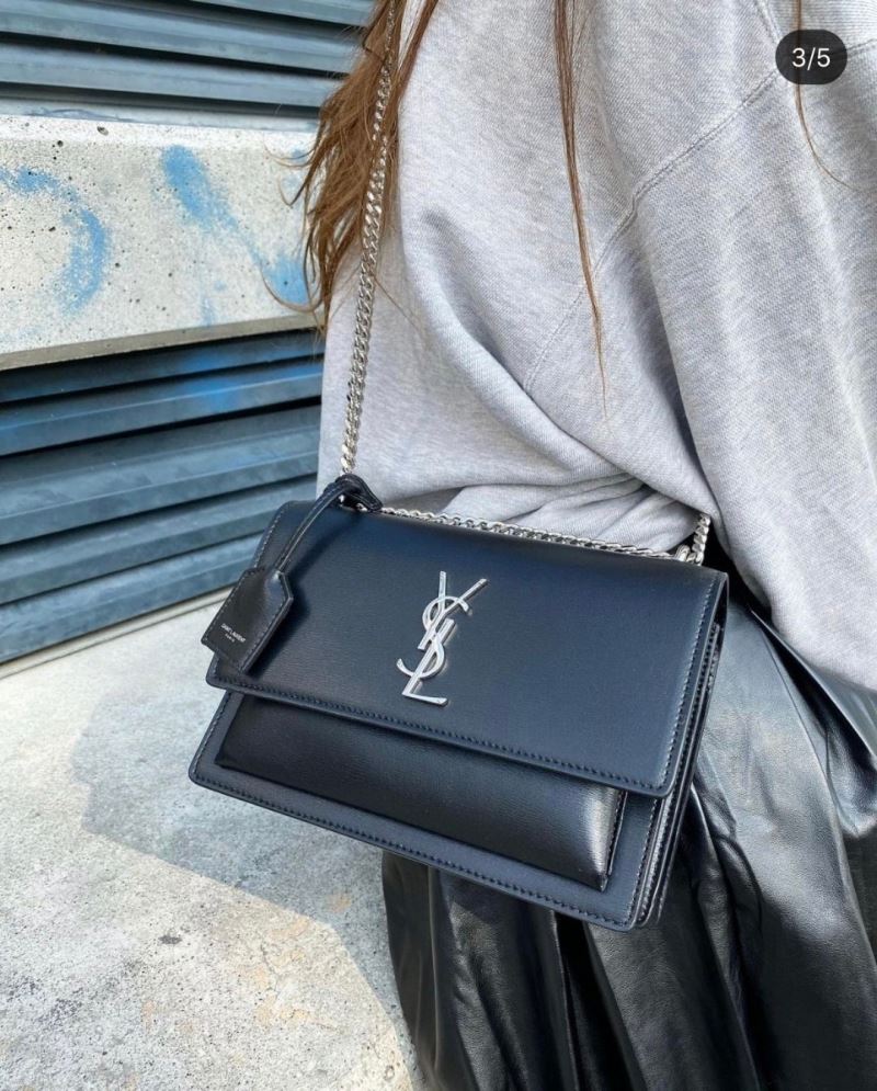 Elevate your everyday style with the sleek and structured YSL Sunset Bag in classic black. Featuring elegant silver-tone YSL monogram hardware, a detachable leather and chain strap, and a compact yet spacious dual-compartment interior – this is the perfect bag for work, dinner, or dressy events.