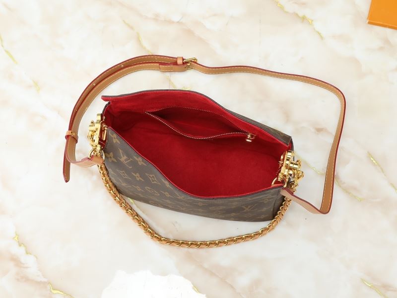 The Bloom pouch combines Louis Vuitton's iconic Monogram canvas with leather on its side panels. This feminine mini bag is notable for its distinctive shape, inspired by a Monogram Flower. It can hold essentials such as a compact wallet, phone, keys and lipstick, and can be worn with or without its delicate, gold-tone chain.