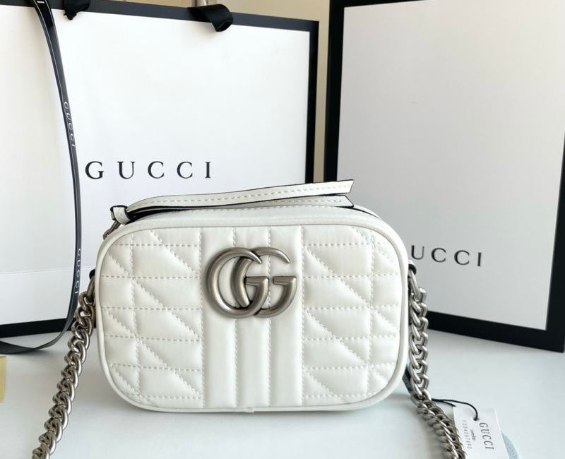The mini GG Marmont chain shoulder bag has a softly structured shape and a zip top closure with Double G hardware. The chain shoulder strap has a leather shoulder detail. The camera bag is made in matelassé leather with a chevron design and GG on the back.