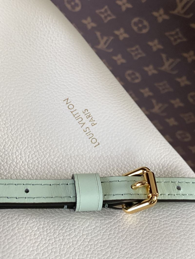 Crafted for the fashion-forward woman, the Louis Vuitton Urban Masterpiece Express Handbag combines timeless elegance with modern flair. This structured silhouette features a sleek mint green and white leather combination, gold-tone hardware, and a top handle for classic styling. It also includes a detachable, adjustable shoulder strap for versatile wear as a crossbody or shoulder bag.